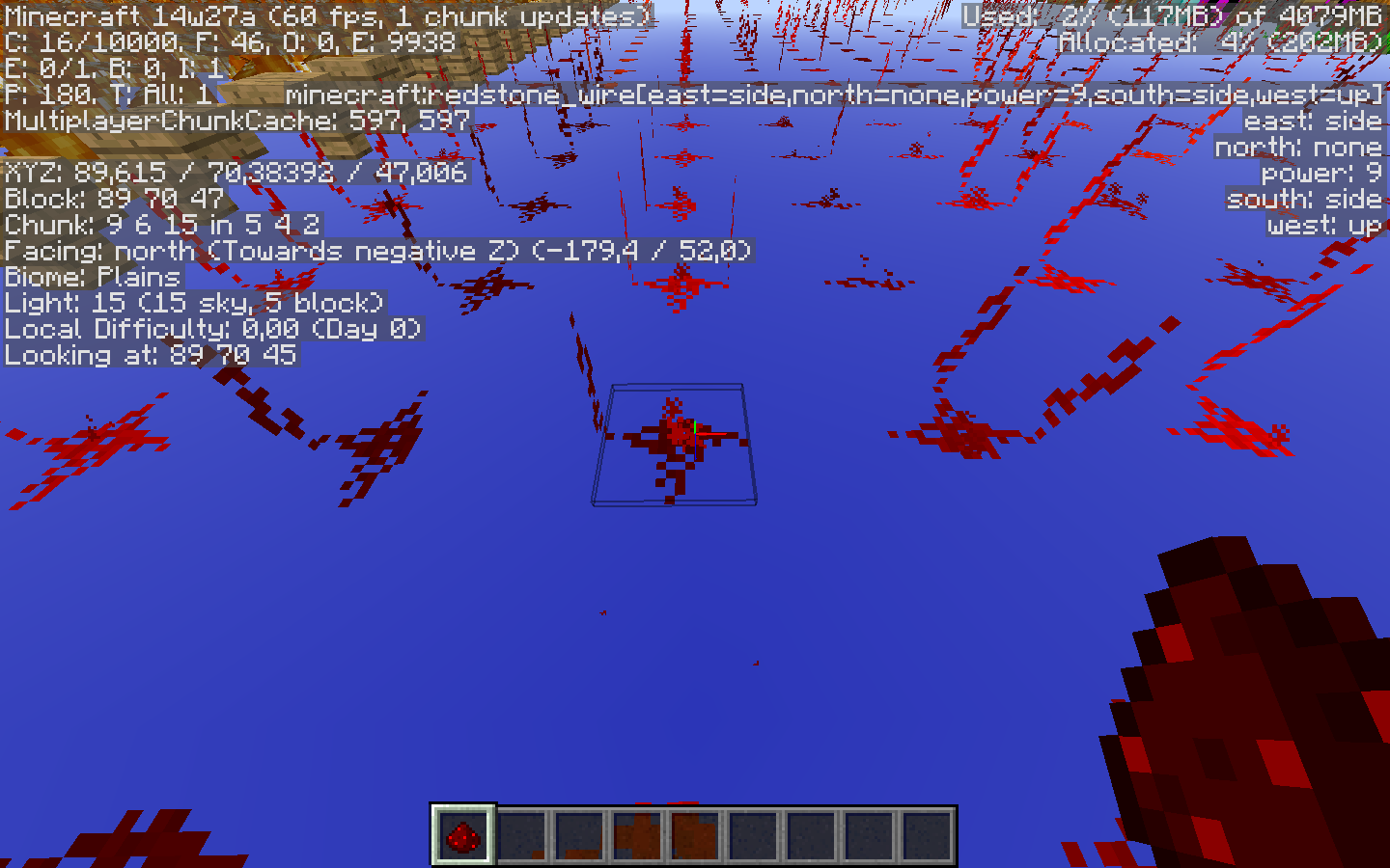 When you break a powered redstone wire in the Debug World it gets replaced with the right model/block but the red colouring indicating that it's powered is missing.