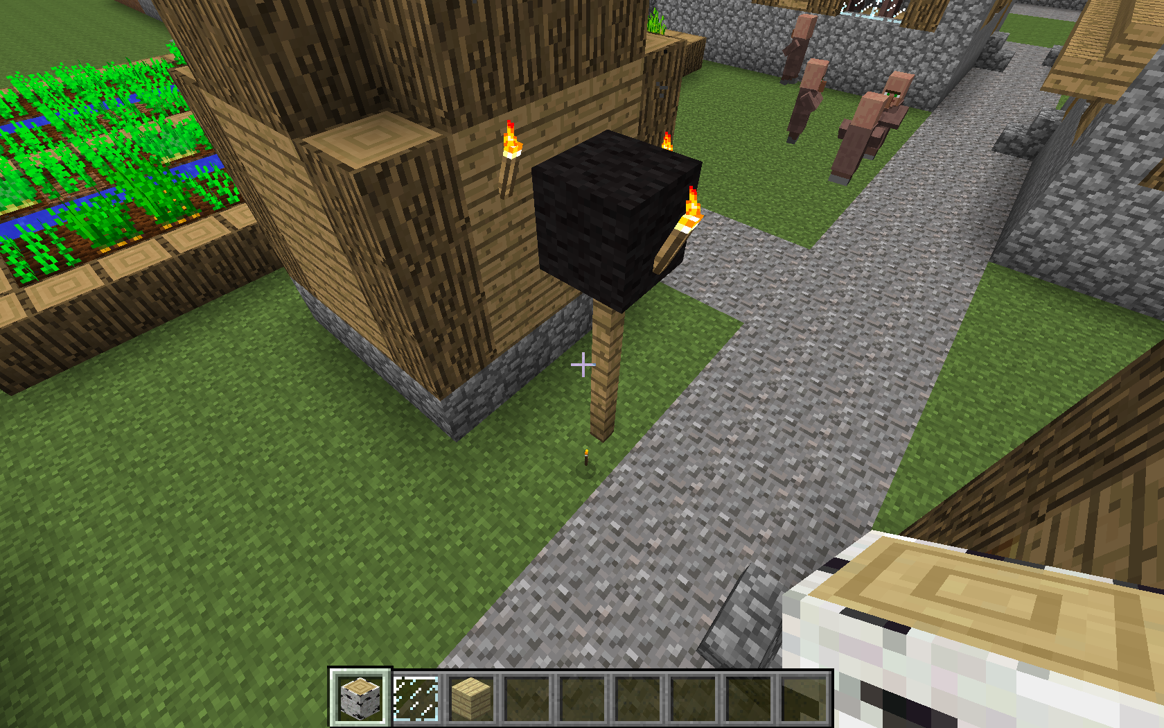 I was playing with my friend when i found a village I went up to one of the light things outside and one of the torches were gone and on the ground broken.
