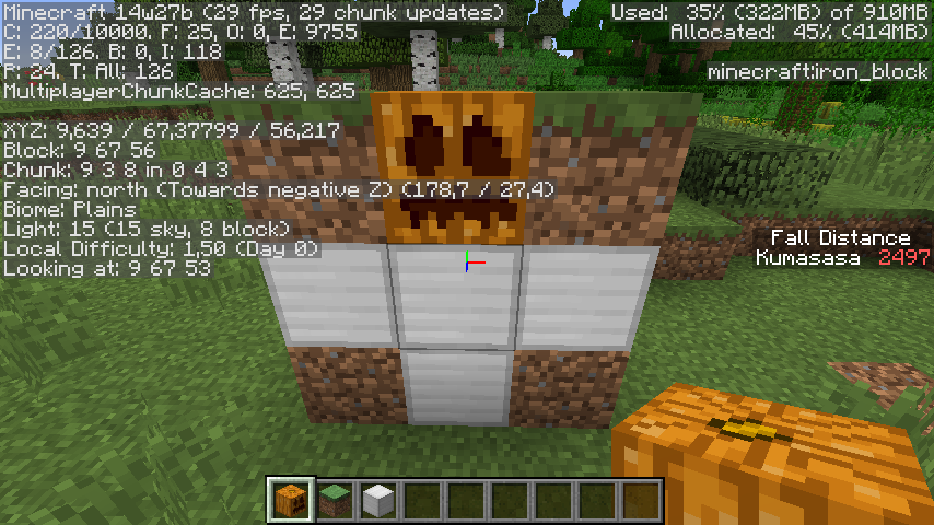 ~#~where # is an iron block, ^ is a carved pumpkin and ~ is an air block. Therefore, it is required that all four blocks around the block pattern are air blocks: