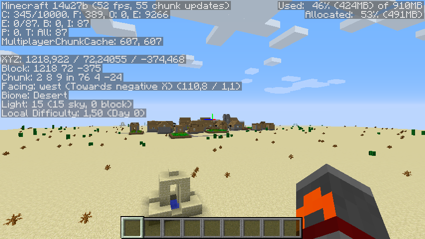 The seed is 7156754079693036187 on a super flat desert preset. The coordinates are provided in image 2014-07-07_11.26.43.png. This bug has also occurred in a survival world as well.