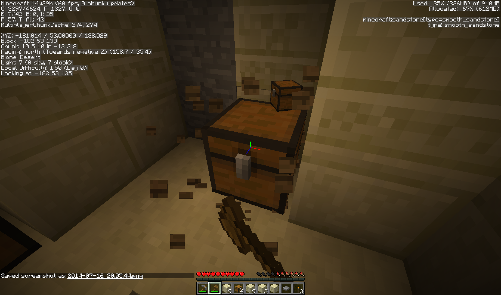 As well, it looks as though there are two chests spawning in the same location when opening them (as seen in the first screenshot). The second shows the particles of having just broken the chest to pick up (you can see the floating chest between the one that remains and the wall). The seed is -631592091127983917, you can see the coordinates for the temple in the screenshots as well. I logged out and back in to find the broken chests gone. Yes, I commented about this in another thread, but wanted to supply screenshots to help in my explanation.