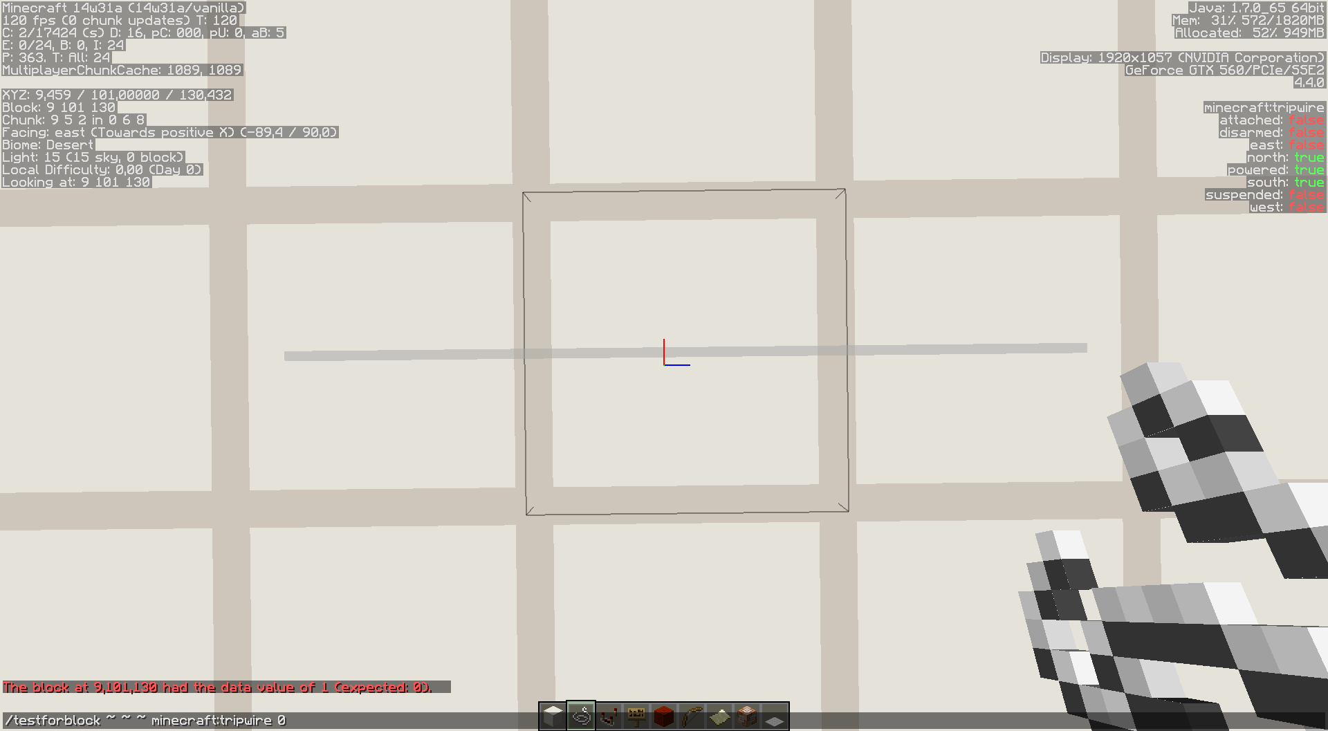 /testforblock ~ ~ ~ minecraft:tripwire 0/testforblock ~ ~ ~ minecraft:tripwire 0while standing at 9, 101, 130 it returned "The block at 9,101,130 had the data value of 1 (expected 0).". (Image 1)