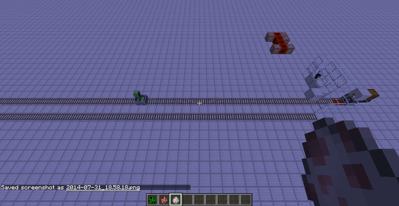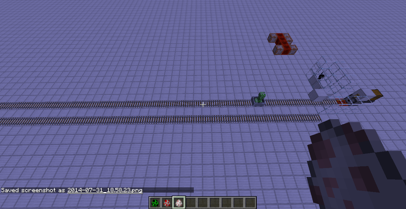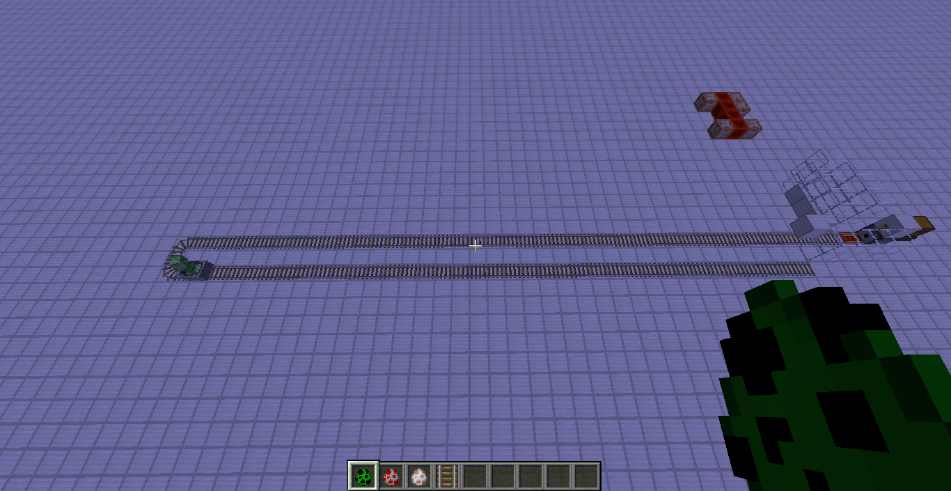 To investigate the cause of this bug I set up a system that places mobs in minecarts and tested it with creepers. Pictures 1 shows a creeper being placed in the mechanism. The minecart eventually comes to a stop (picture 2), showing that the creeper did not control the minecart at all. Placing cats next to the creeper (picture 3) also caused no response, which further shows that the creeper was not in control of the minecart.
