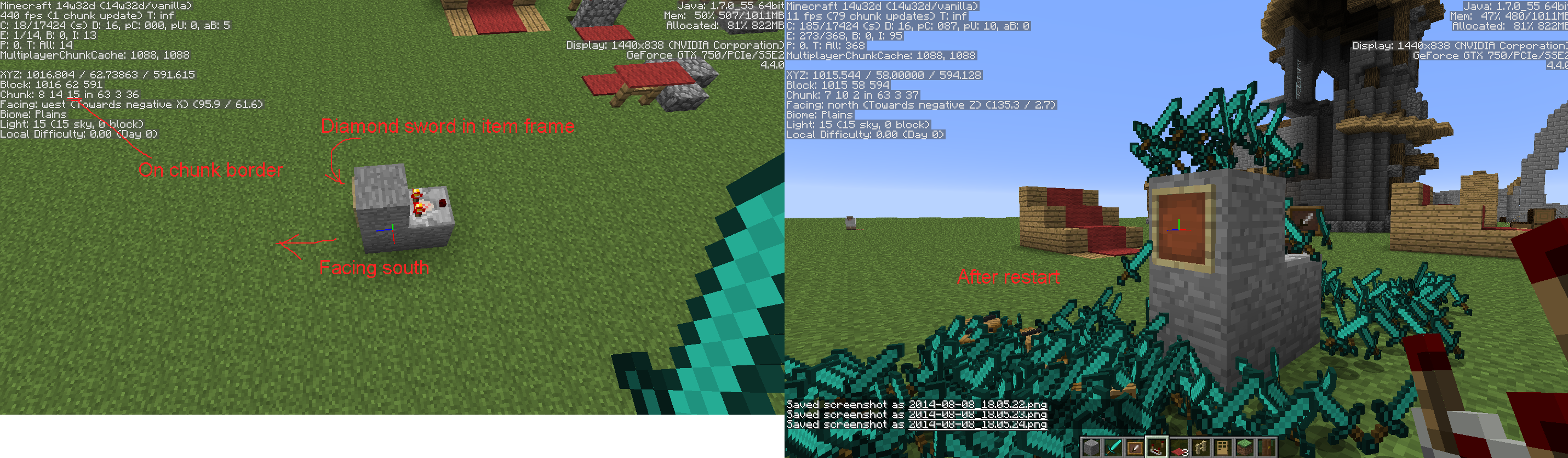 By placing 3 blocks into a 2 tall L shape on the border of a chunk, facing south and placing a comparator onto the out facing block and an item frame on the 2 high wall on the other side and exiting and re-entering again and then destroying the item frame causes the item frame and whatever is inside it to duplicate stacks of said item.