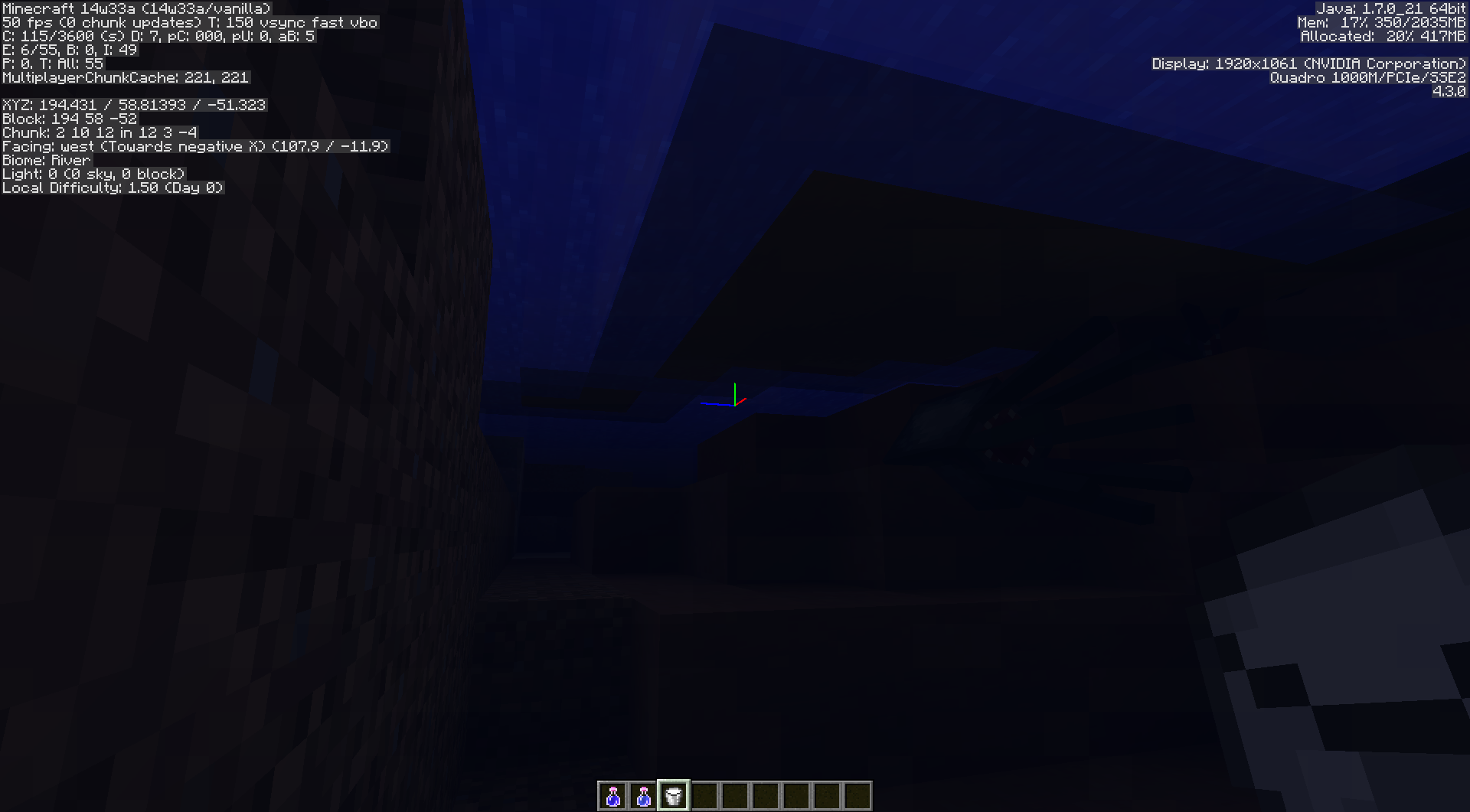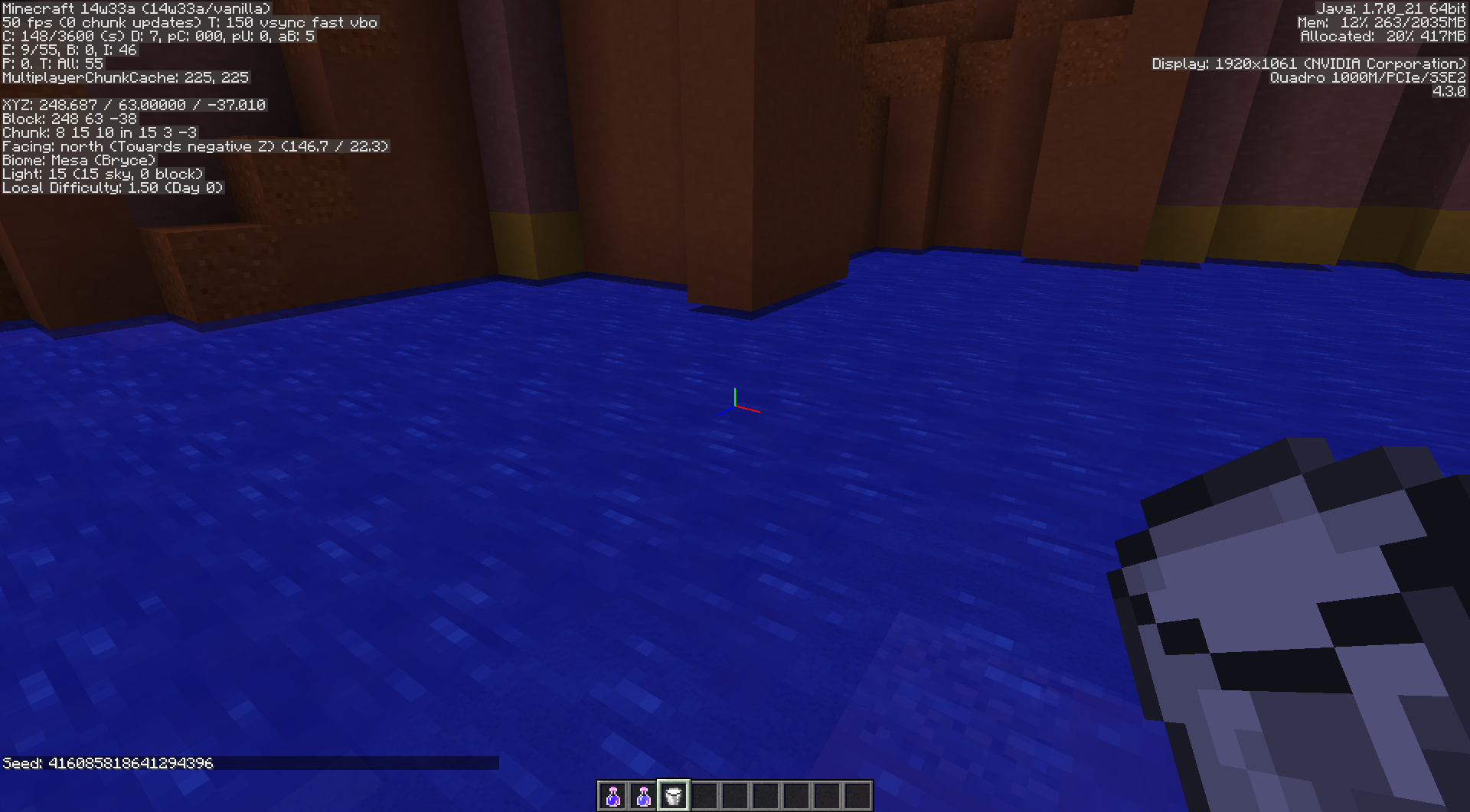 In a newly-created map, near spawn there is a very large Mesa biome that contains a smaller Bryce variant with a river running through it. Near the edges of the river, the edges of the Bryce variant appear to stop generating blocks normally over the water. That is, some of the land sits atop the water without actually continuing to where you'd expect its base to be.