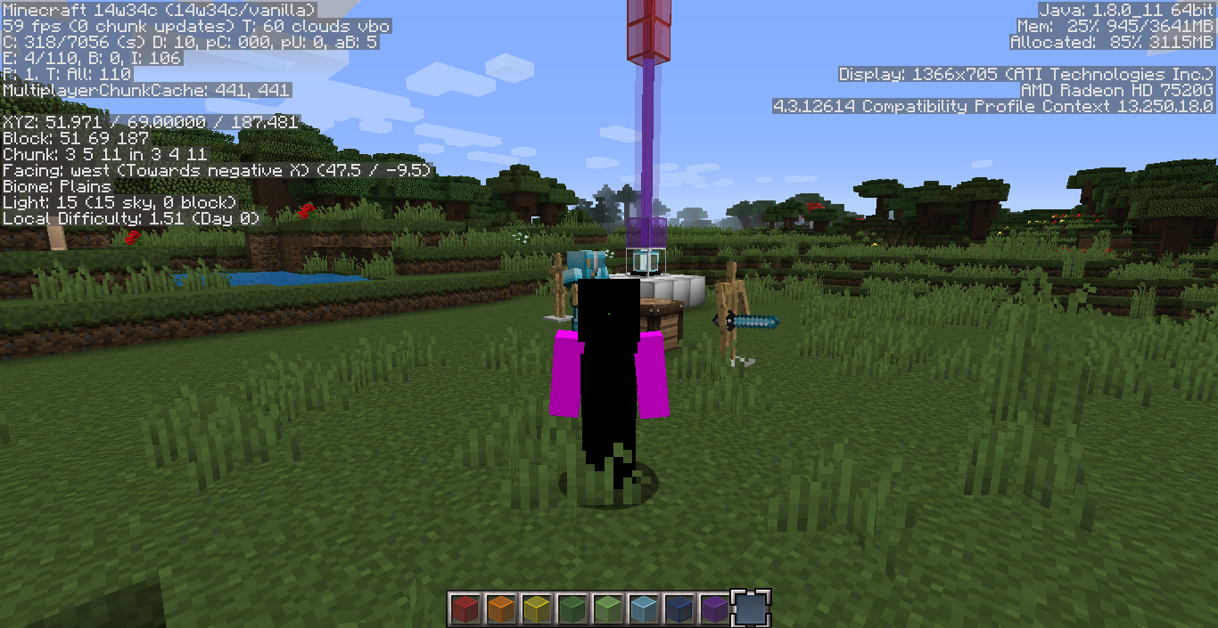 I logged into the game, loaded a world, and noticed my skin was using the "missing texture" texture. A screenshot of this is attached.