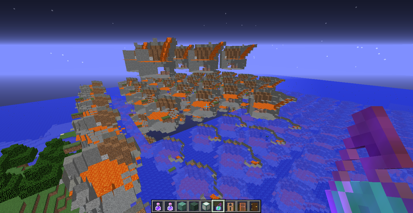 I was flying around an ocean to find an ocean monument, but instead found an area where all the chunks rendered very strangely. Each one seemed to render the same section in stacks as the screenshots show. They changed rapidly what was rendered even when paused. Approaching the area had no effect, neither did reloading the chunks with f3 + a or reloading the world. Logging out and back in again fixed the issue.