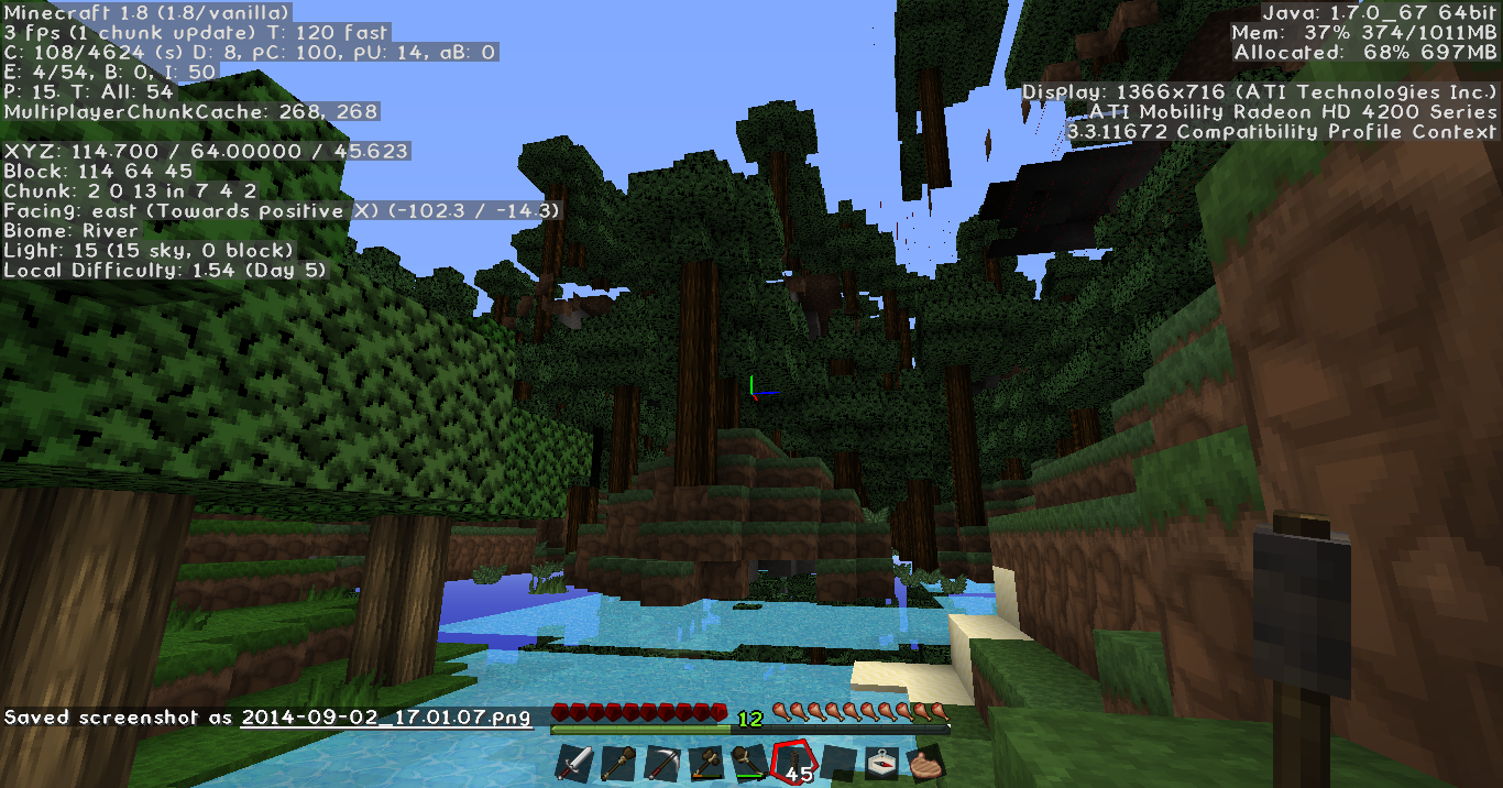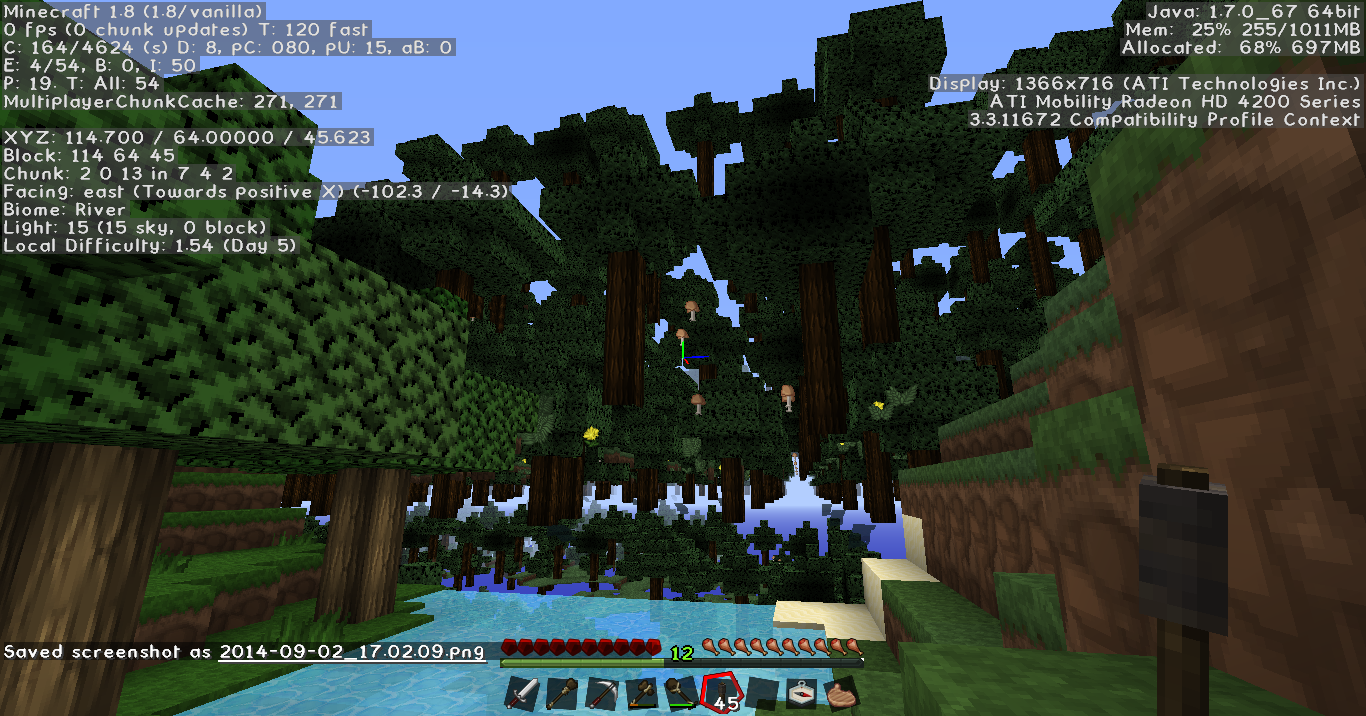 I started a new world to test how 1.8 plays for me. After a few game days of gathering local resources, I decided to go explore past the immediate area. After going over a hill, I found a section where the world kept flashing between possible biome and render options - flat, hilly, taiga, forest, and even lava. I tried walking forward into said area to see if the graphics would stabilize, but they did not. The following screenshots happened in rapid succession.
