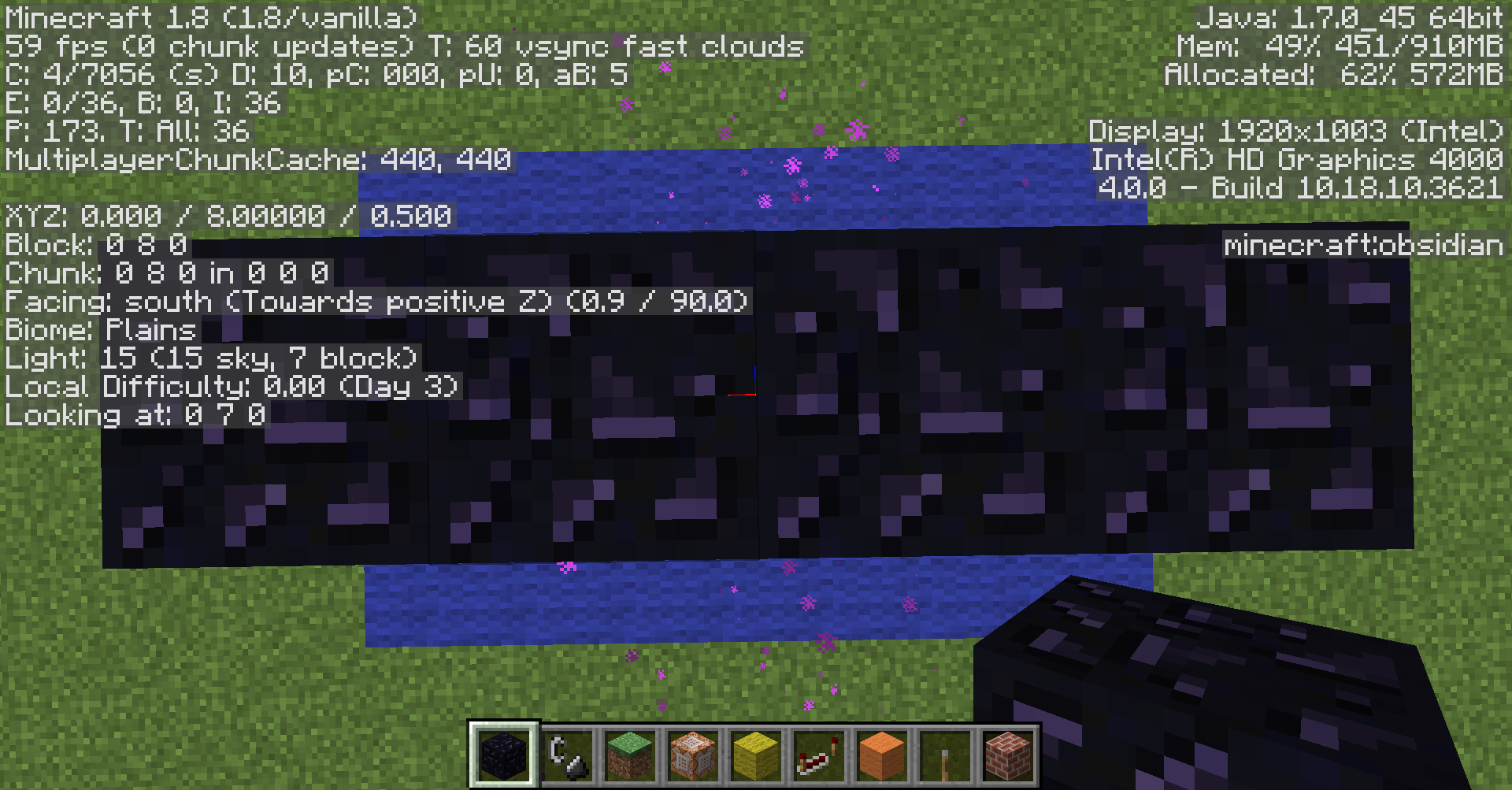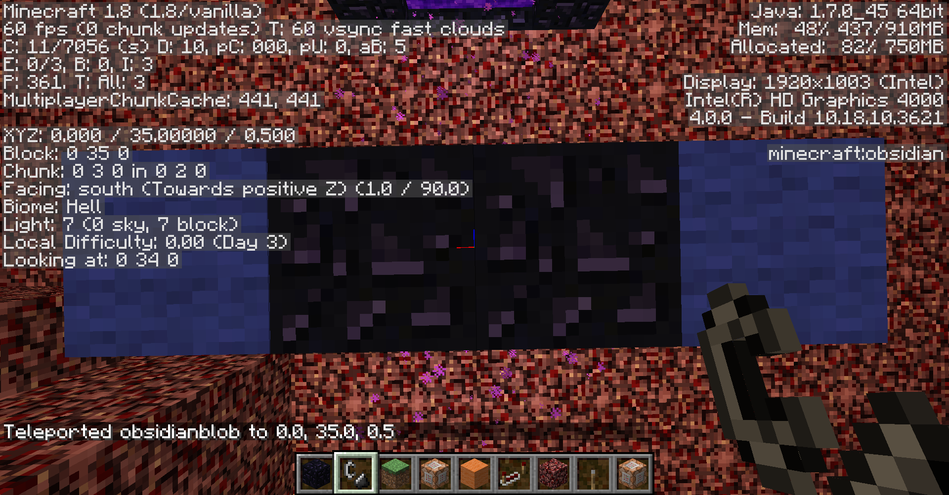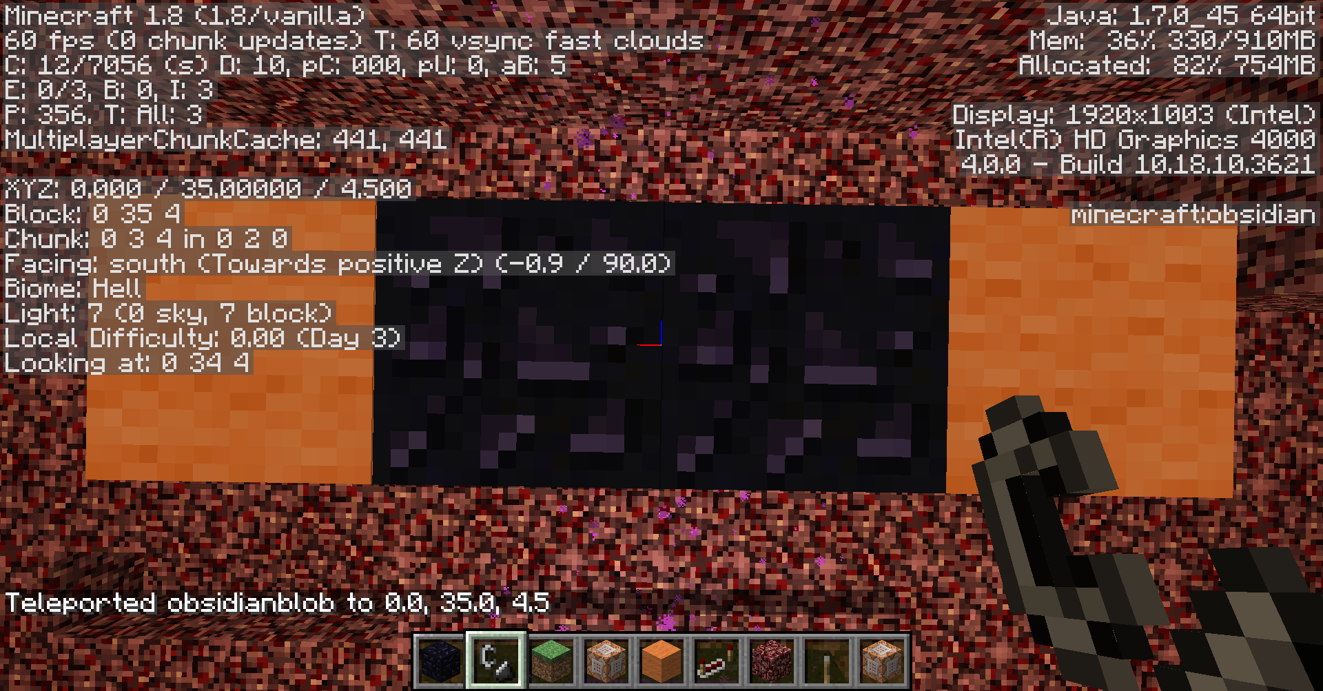 Next, go to the overworld to x=0.0 and z=0.5. (Not sure if the y value matters.) Build a portal at that spot. Now go over to x=0.0 and z=32.5. Build a second portal here.