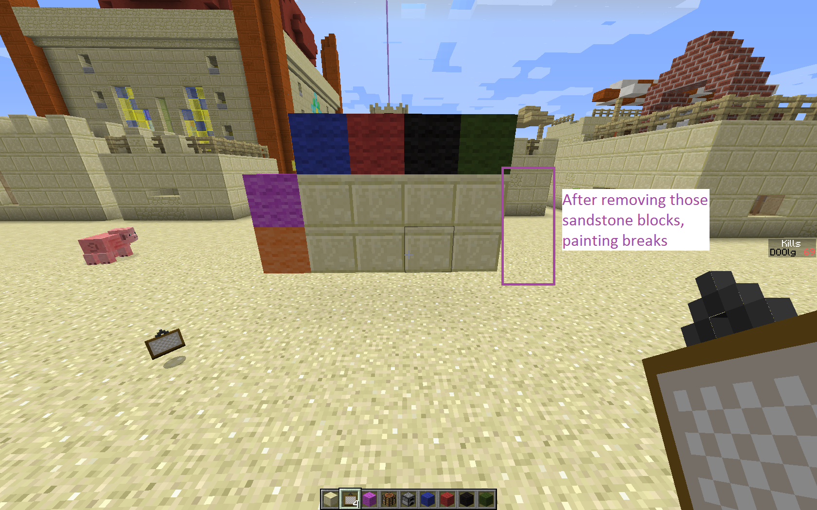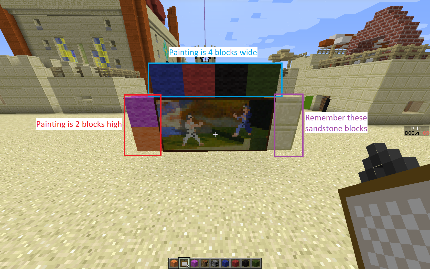 "2 men karate" painting holds 2 extra blocks. It is 4 blocks wide and 2 blocks high, which means that those blocks are extra. Trying to place that painting on a 4 b. wide and 2 b. high wall will not work (that painting won't place). Placing it on a 5 b. wide wall will work but when removing those blocks, painting will break (see the screenshots).