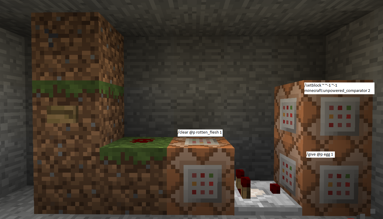 I built a command block circuit (please look at screenshots), which should give you an egg and take a rotten flesh (for an adventure map). Circuit 1 works as expected (gives you an egg for a rotten flesh), but Circuit 2 gives you two eggs while you still give one egg. Also, the whole thing doesn't work when there's an repeater behind the comparator.