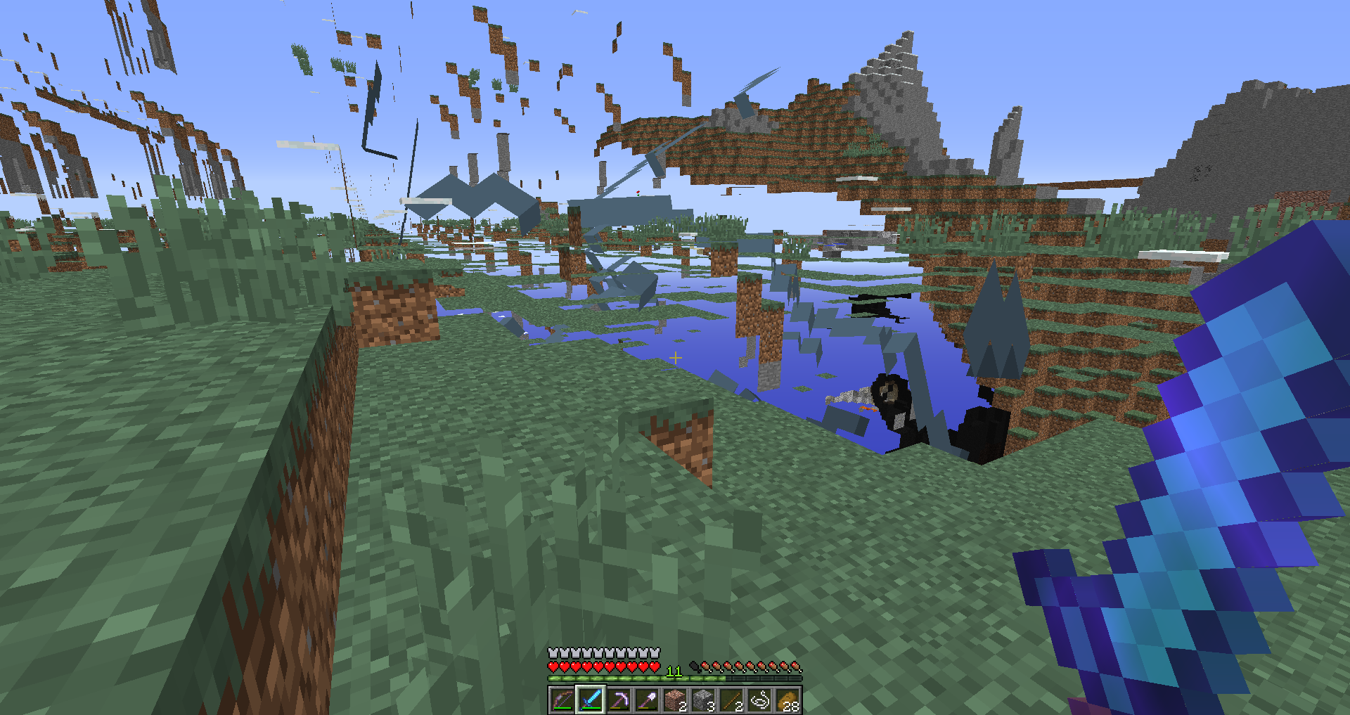 Player model disappears in inventory screen and when in F5 mode except for the main arm. Aggressive mobs (except witches) are invisible except for their weapons and shadows. Setting the render distance past 7 affects the landscape and morphs moving mobs like squids into giant, scary looking scary things.