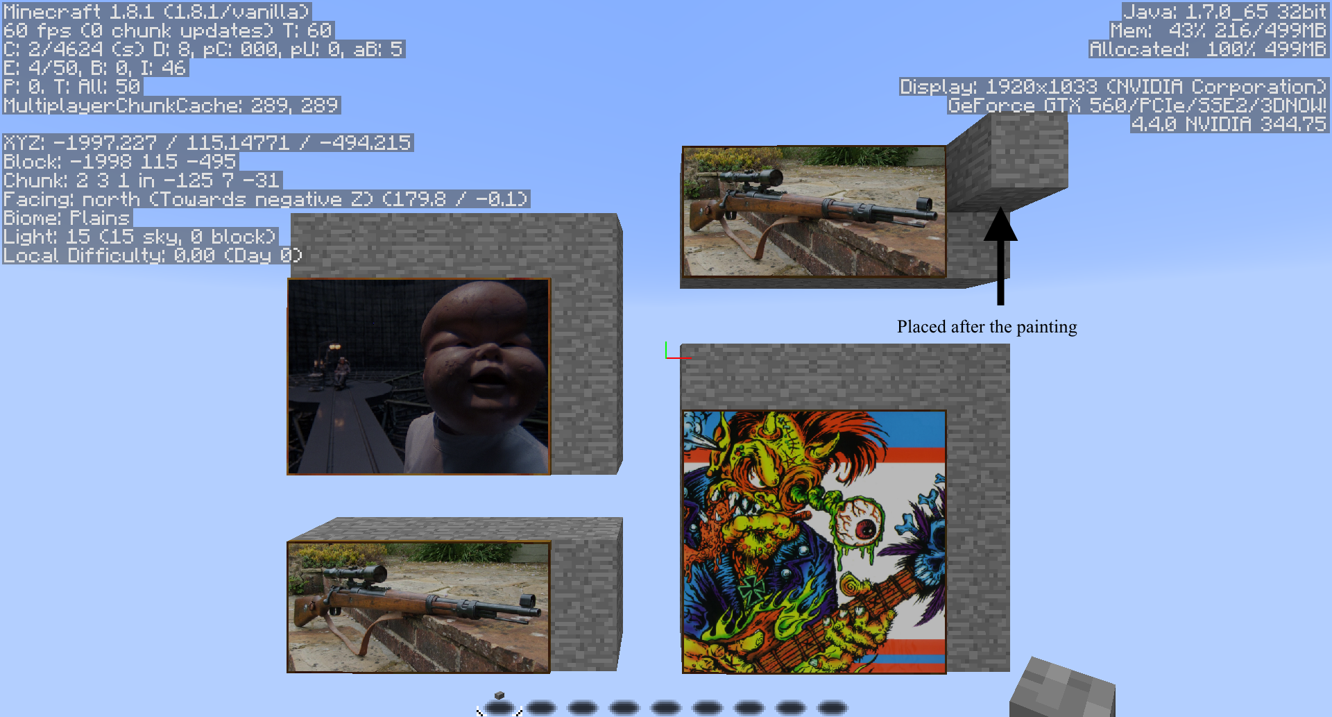 The 2x4 painting requires a 2x5 area, the 3x4 requires 4x5, and the 4x4 requires 5x5. They pop off if one of the uncovered yet required blocks is destroyed; However, if a block is placed after the painting or if a block was in the uncovered area prior to placement it will remain affixed.