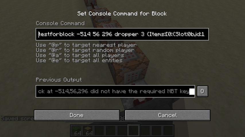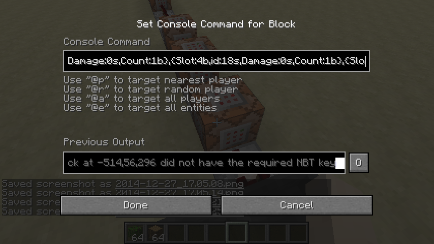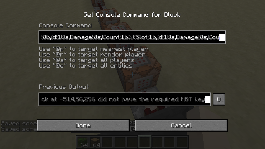 testforblock -514 56 296 dropper 3 {Items:[0:{Slot:0b,id:18s,Damage:0s,Count:1b},{Slot:1b,id:18s,Damage:0s,Count:1b},{Slot:2b,id:18s,Damage:0s,Count:1b},{Slot:3b,id:18s,Damage:0s,Count:1b},{Slot:4b,id:18s,Damage:0s,Count:1b},{Slot:5b,id:18s,Damage:0s,Count:1b},{Slot:7b,id:17s,Damage:0s,Count:1b}]}testforblock -514 56 296 dropper 3 {Items:[0:{Slot:0b,id:18s,Damage:0s,Count:1b},{Slot:1b,id:18s,Damage:0s,Count:1b},{Slot:2b,id:18s,Damage:0s,Count:1b},{Slot:3b,id:18s,Damage:0s,Count:1b},{Slot:4b,id:18s,Damage:0s,Count:1b},{Slot:5b,id:18s,Damage:0s,Count:1b},{Slot:7b,id:17s,Damage:0s,Count:1b}]}