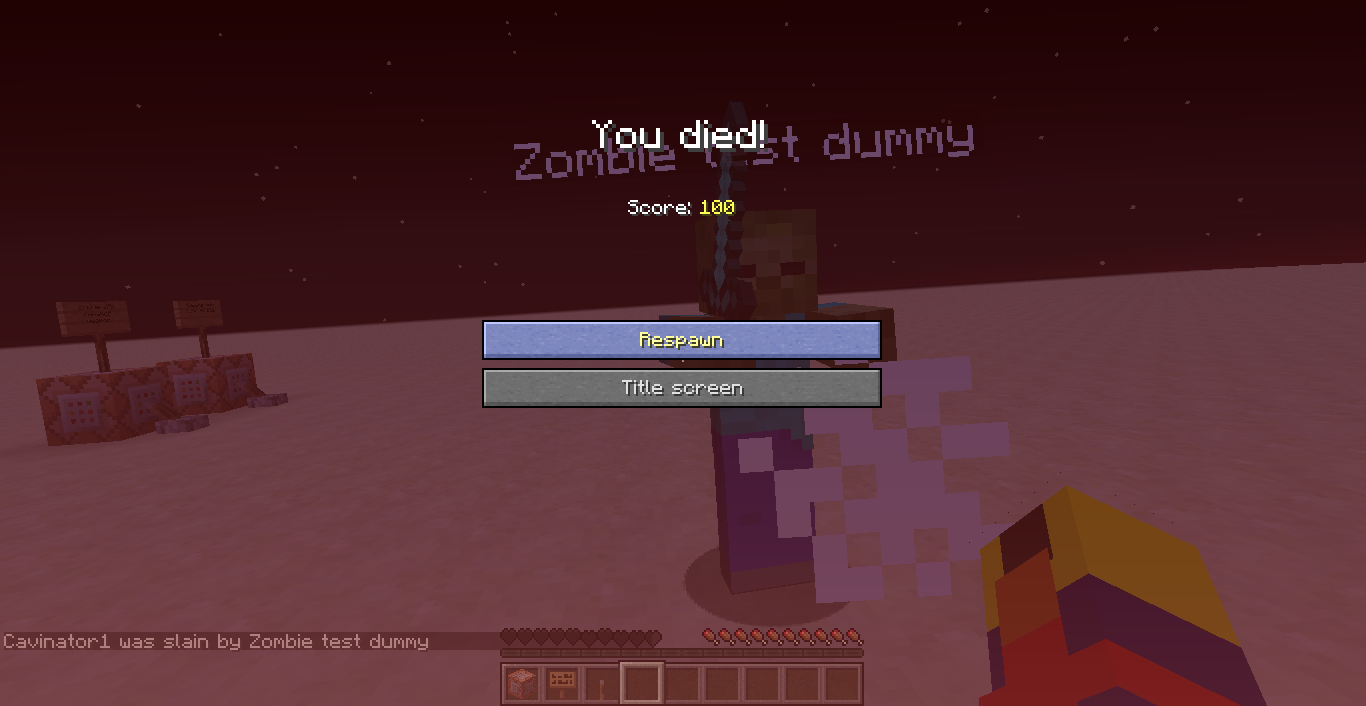 3. The death message says: <player name> was slain by Zombie test dummy, as seen in Screenshot 1. But it should actually say <player name> was slain by Zombie test dummy using [This Sword]