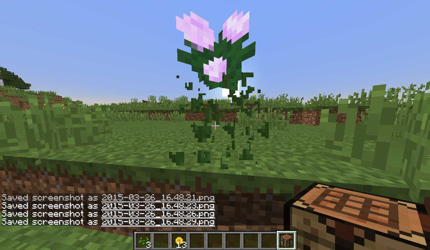 So I was breaking things such as flowers, grass, ferns, etc and started to notice that occasionally a Peony flower would appear, floating in mid air for a split second when I broke any foliage more than one block tall. very rarely the icon of the peony flower would appear as if I was receiving the item. I have managed to catch a few screenshots of it.