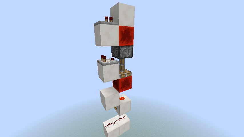 A inverted one tick pulse "unBUDs" a piston, updated by a comparator. Said piston retracts, depowering the redstone piece below the attached redstone block. The torch on the redstone piece's block then activates after a tick, powering the block above back to it's source wich in turn deactivate the torch one tick after, and before it can repeat the redstone block is pushed back in place.