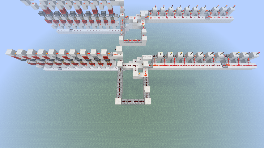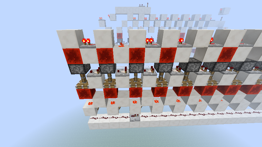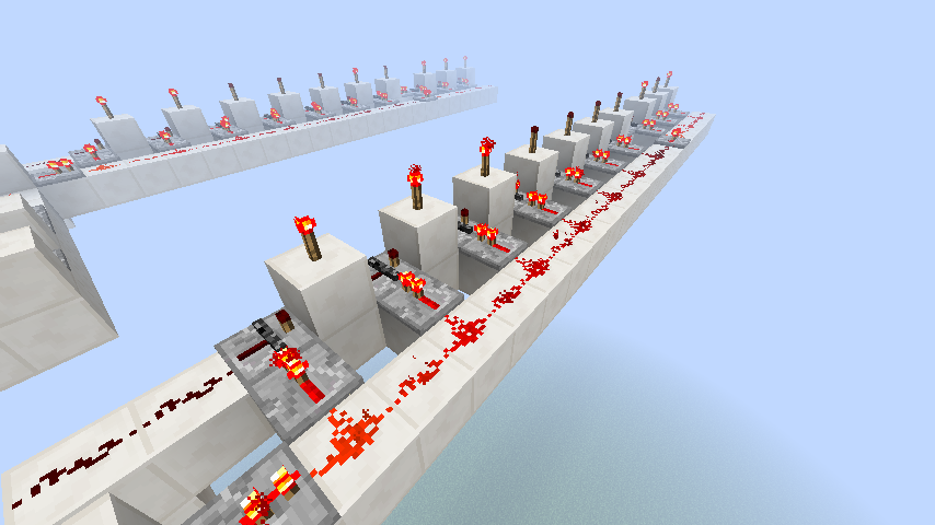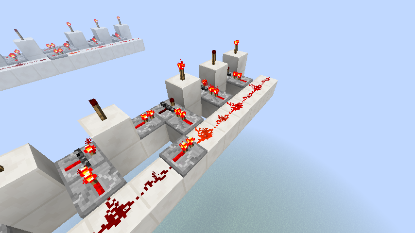 When placing the first 6 redstone blocks (the upper ones to prevent a pulse and write a 0) from right to left as shown in screenshots, the fifth bit is made a 1 in place of a 0. Place a redstone block in 6th bit and the 5th is a 0 again.