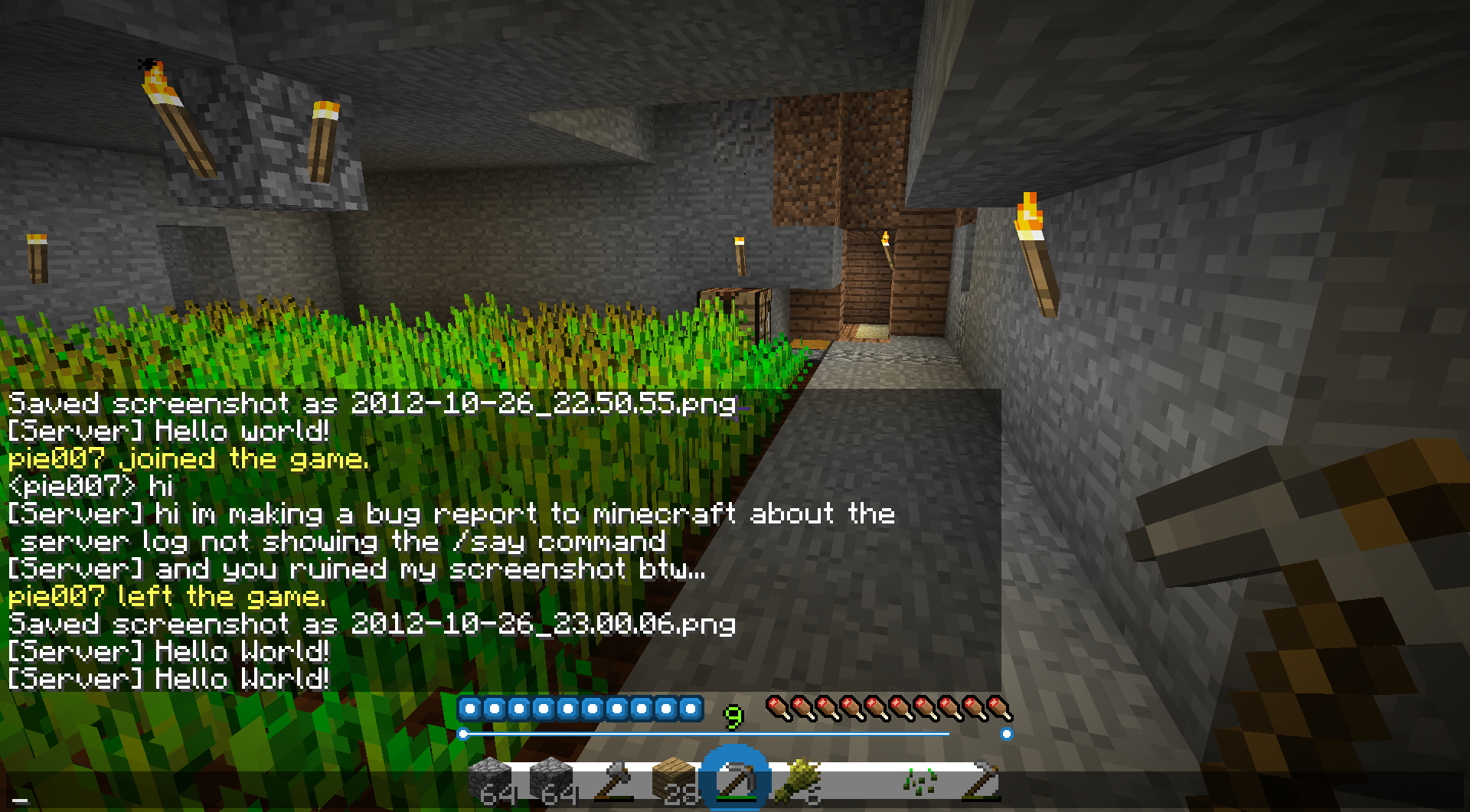 2013-01-27 17:55:40 [INFO] [Server] hello2013-01-27 17:55:22 [INFO] Starting minecraft server version 13w04a