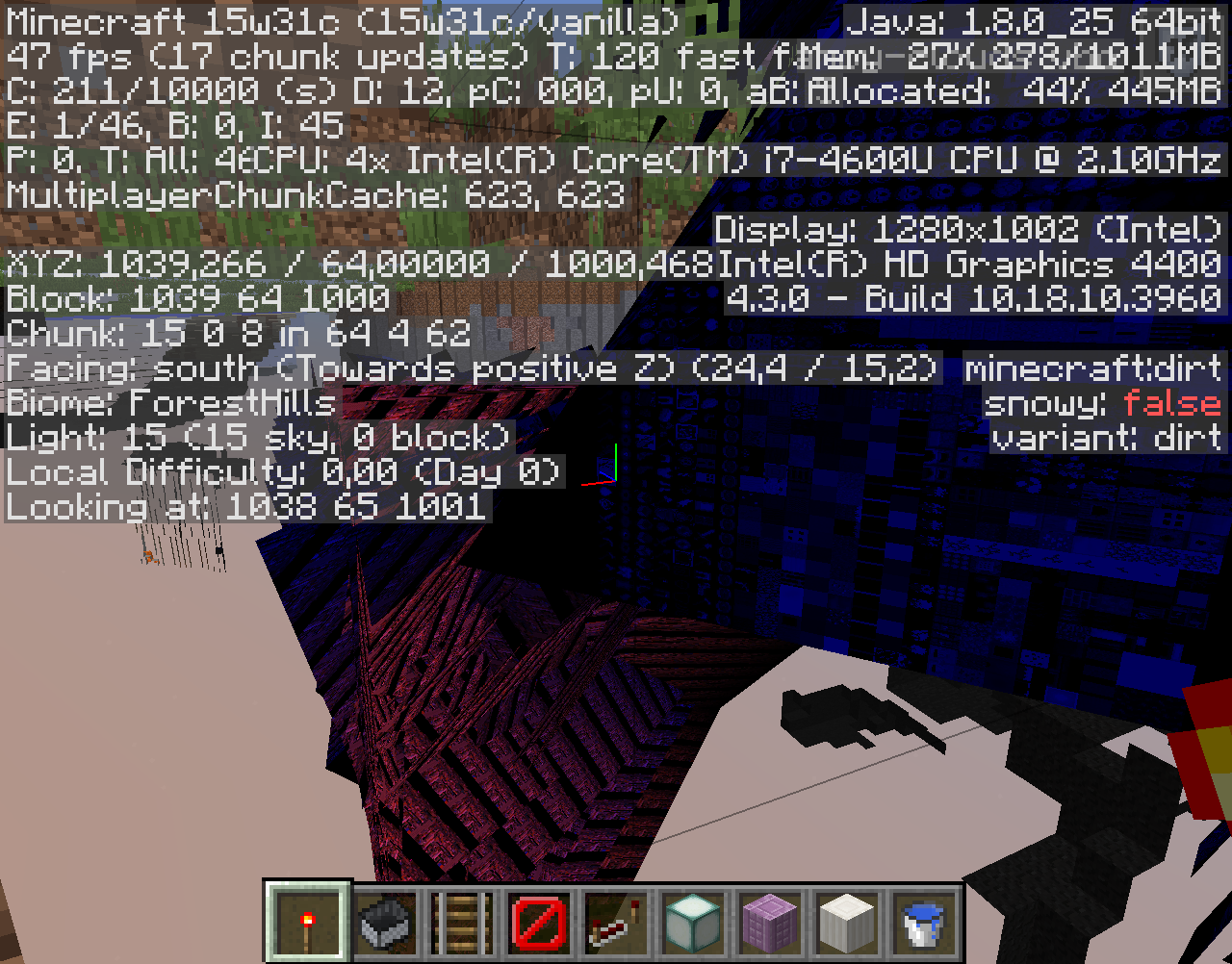 Turning on VBO creates wierd random areas that have blue or red "spikes"(See the pictures). Has items/block resources on them, makes near areas invisible.
