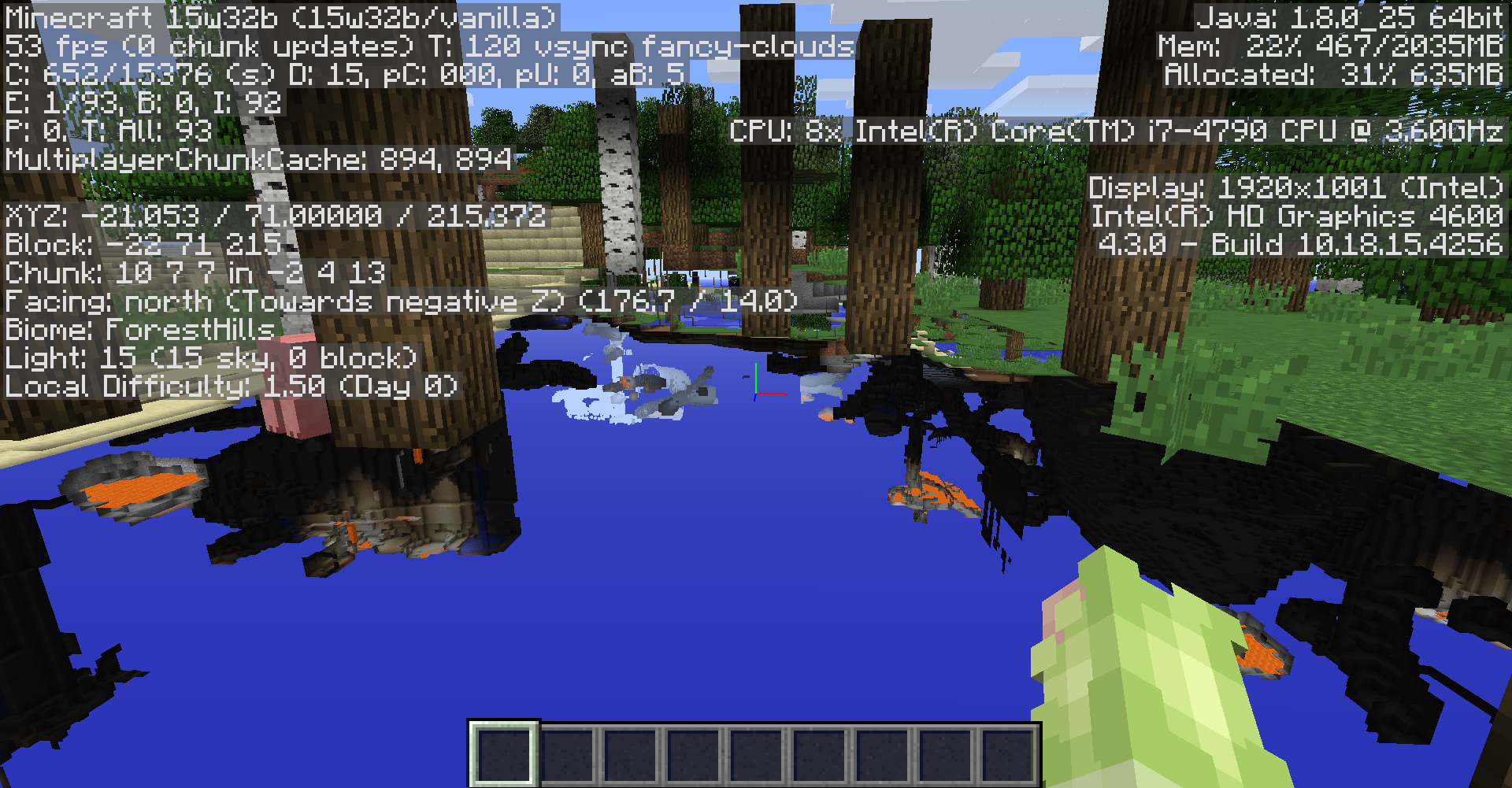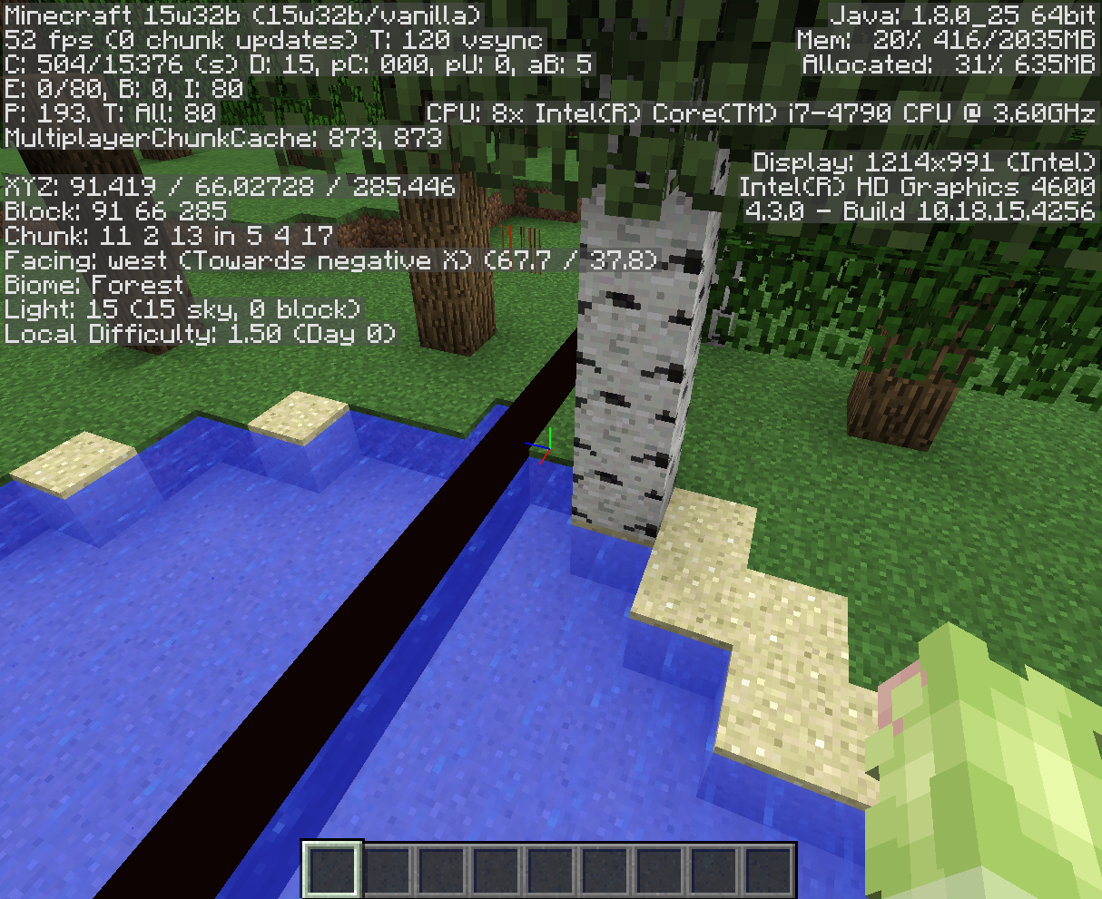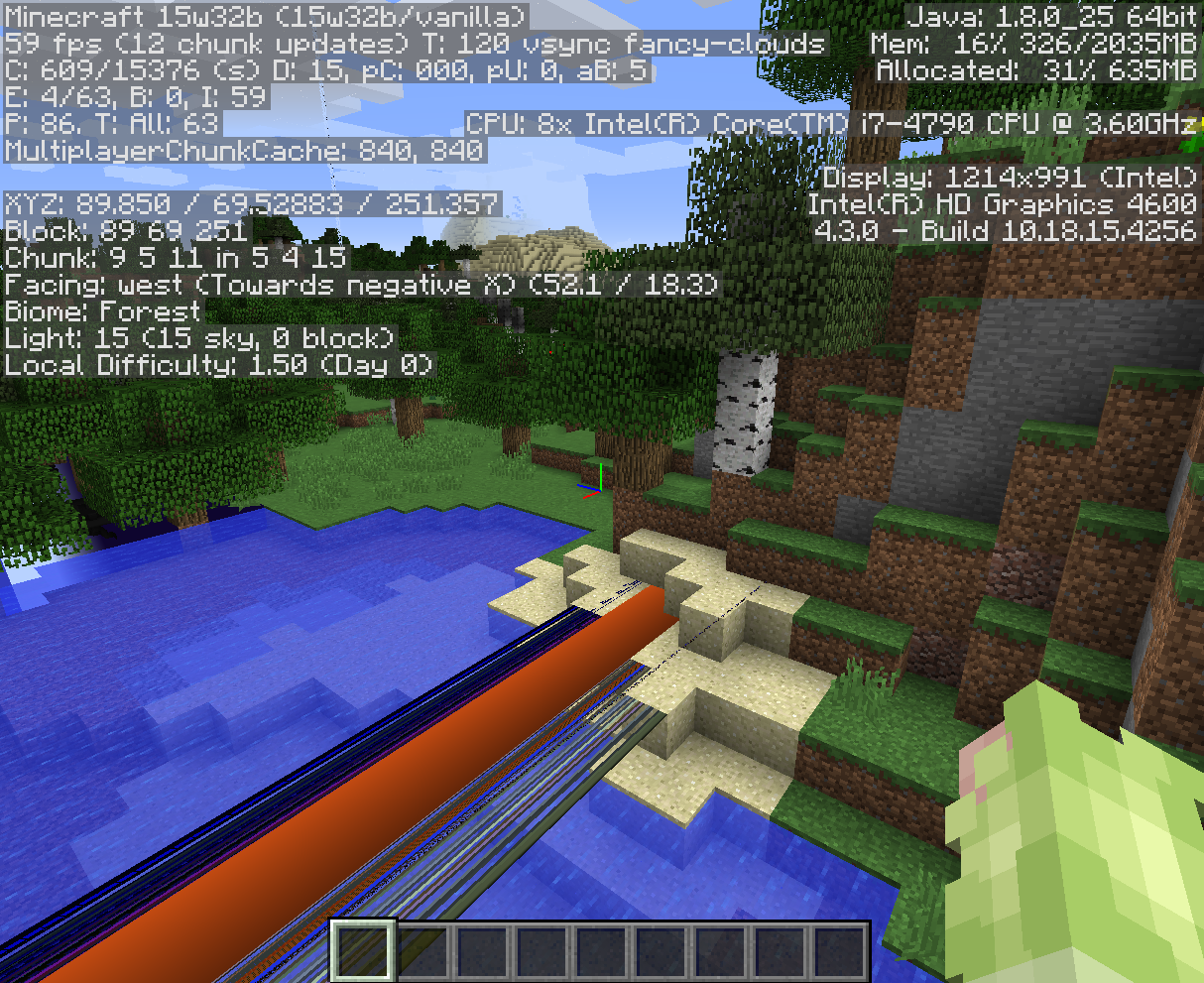 I've attached some pretty weird images from a world created in 15w32b. Before you ask, my graphic drivers are up to date as of 7-17-15 (the latest release). The missing textures (seeing through the chunk) never go away even if you leave and return. The black line in picture 3 shows up from either side if you fly through it. These occur on every world opened or created in the snapshot. Default texture pack.