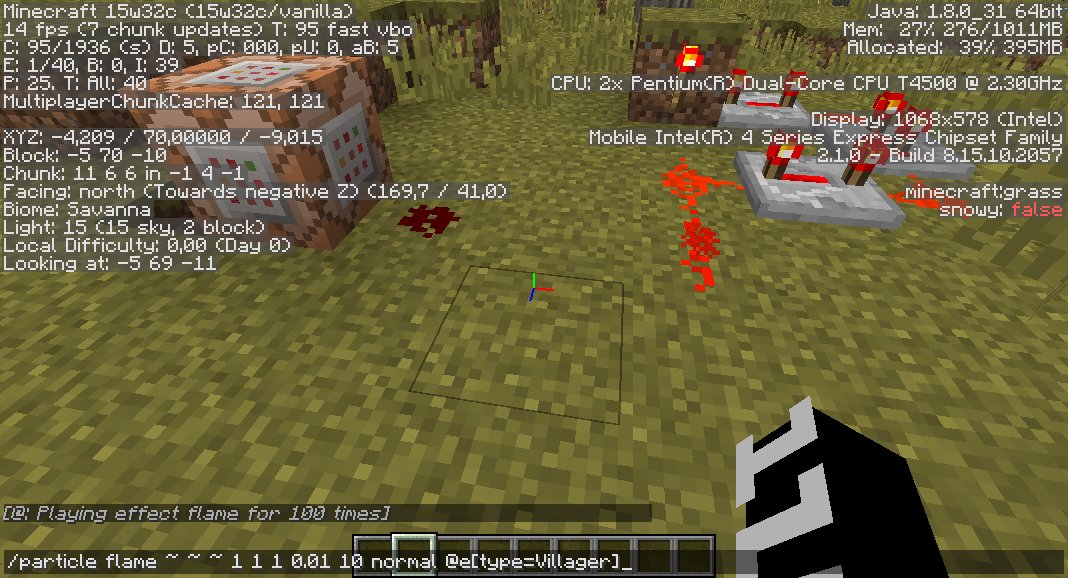 3. Insert this : "/particle flame ~ ~ ~ 1 1 1 0.01 10 normal @e[type=Villager]" on the command block