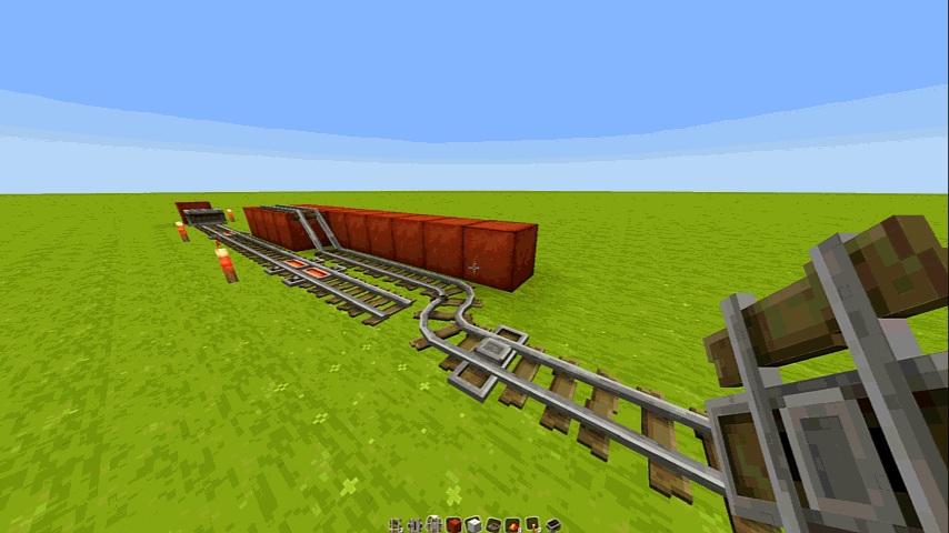 The detector rail is on the left and passing it will cause the curved rail to change orientation. We start our cart not from the detector, but from where the rail is bend to. After starting the cart it goes into the bend and before leaving it, the detector will react. This causes a flicker in which the cart and the rail change orientation several times to then finally settle in the right-side position as in