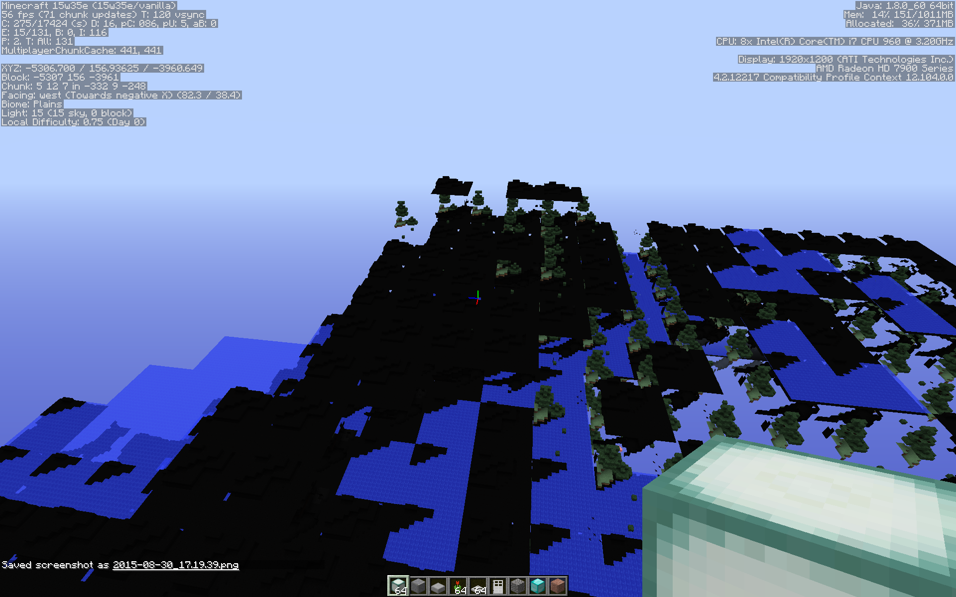 Repeated use of /fill and /clone to build structures sometimes results in a circumstance where the updated blocks do not immediately appear after issuing the command. Disconnecting from the server and reconnecting then results in very strange visual artefacts that flicker rapidly through various configurations from frame to frame. These artefacts seem to be related to some sort of corruption in the client state; repeatedly signing out and back in does not clear the artefacts, but a full restart of the client does, without requiring any action on the server.