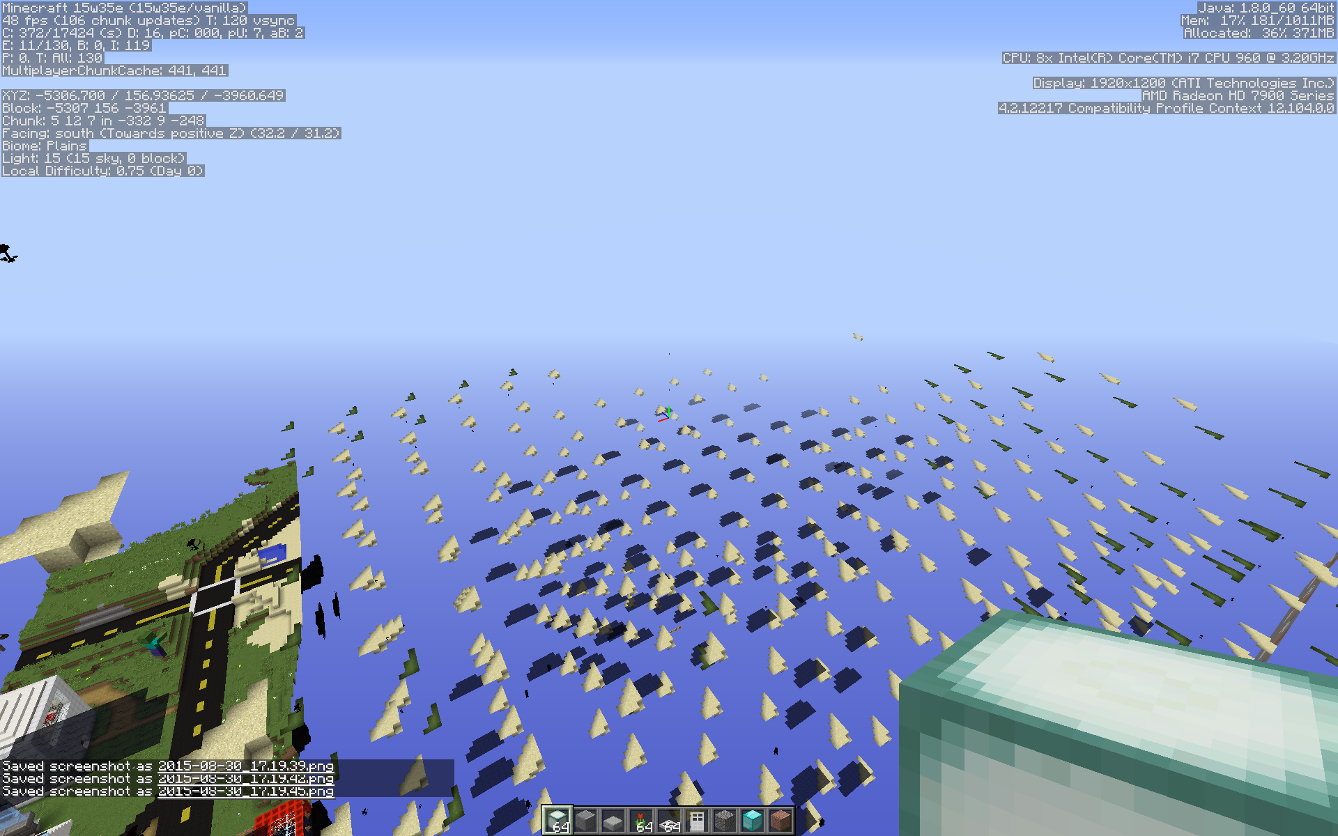 The attached screenshots were all taken within a few seconds of one another in roughly the same location in the world, just rotating the point of view.