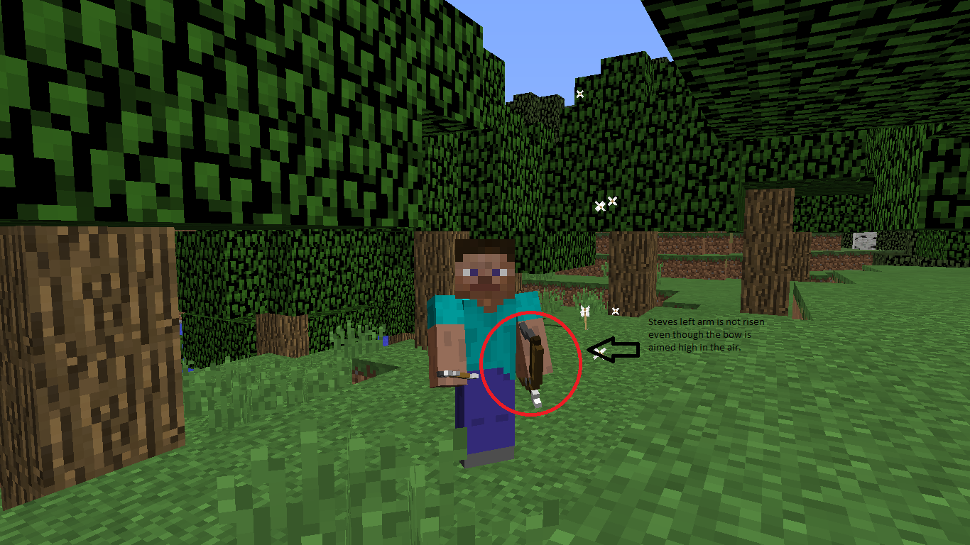 One addition to 15w37a is that a bow can be used in the extra hand slot. However when I try to use the bow in f5 view you cannot se the animation of the bow being lifted up. When you use a bow in the normal hand, Steve's hand rises up to where he is aiming but this does not happen. Attached is a screenshot of what I have described.