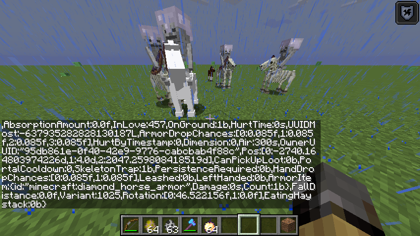 I tamed a horse and gave it diamond armor, then I gave it the new SkeletonTrap tag and set it to 1b (Using /entitydata @e[type=EntityHorse,c=1] {SkeletonTrap:1b}). As expected, the horse turned into 4 skeleton horses, but one of them had a white texture and when you open its inventory, you can see the diamond horse item but it's in no slot and doesn't show up its name. You can also take it out, but the texture of the horse still stays white.