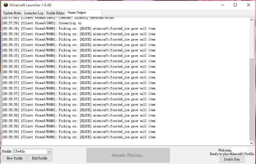 [Client thread/WARN]: Picking on: [BLOCK] minecraft:frosted_ice gave null item[Client thread/WARN]: Picking on: [BLOCK] minecraft:frosted_ice gave null itemI think there should be a check for frosted ice to make sure this isn't send to the console.