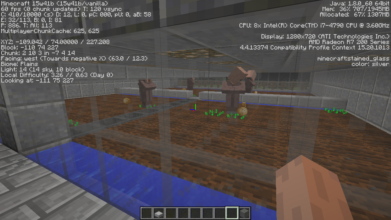 Brown robe villagers (Farmer, Fletcher, Fisherman, Shepherd) no longer plant crops in nearby tilled soil, even with full seed inventories. Further, they rarely move. In a 8x8 plot, they will plant between 5 and 10 crops over about 4 Minecraft days. If the player pushes the villager over tilled soil the villager will plant seeds. This started in 15w41b, and is still true in 15w42a and 15w43a.