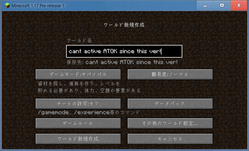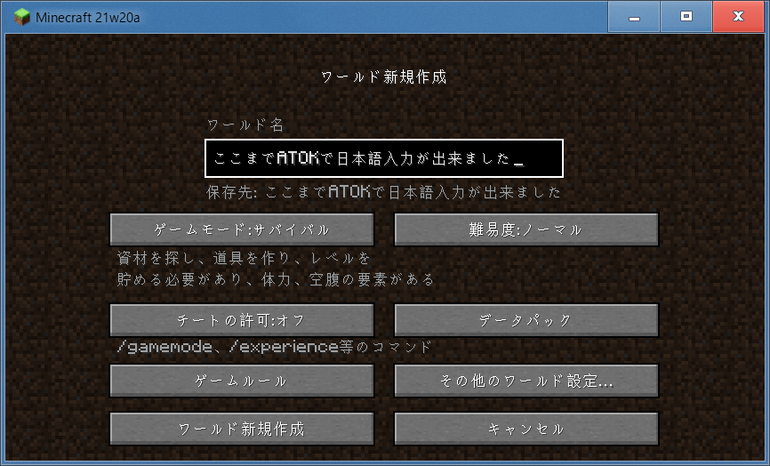 Typing some texts using ATOK (japanese input method commonly used in Japan) don't work since 1.17 pre-release 1. Able to use ATOK until MC 1.16.5 and snapshot 21w20a.