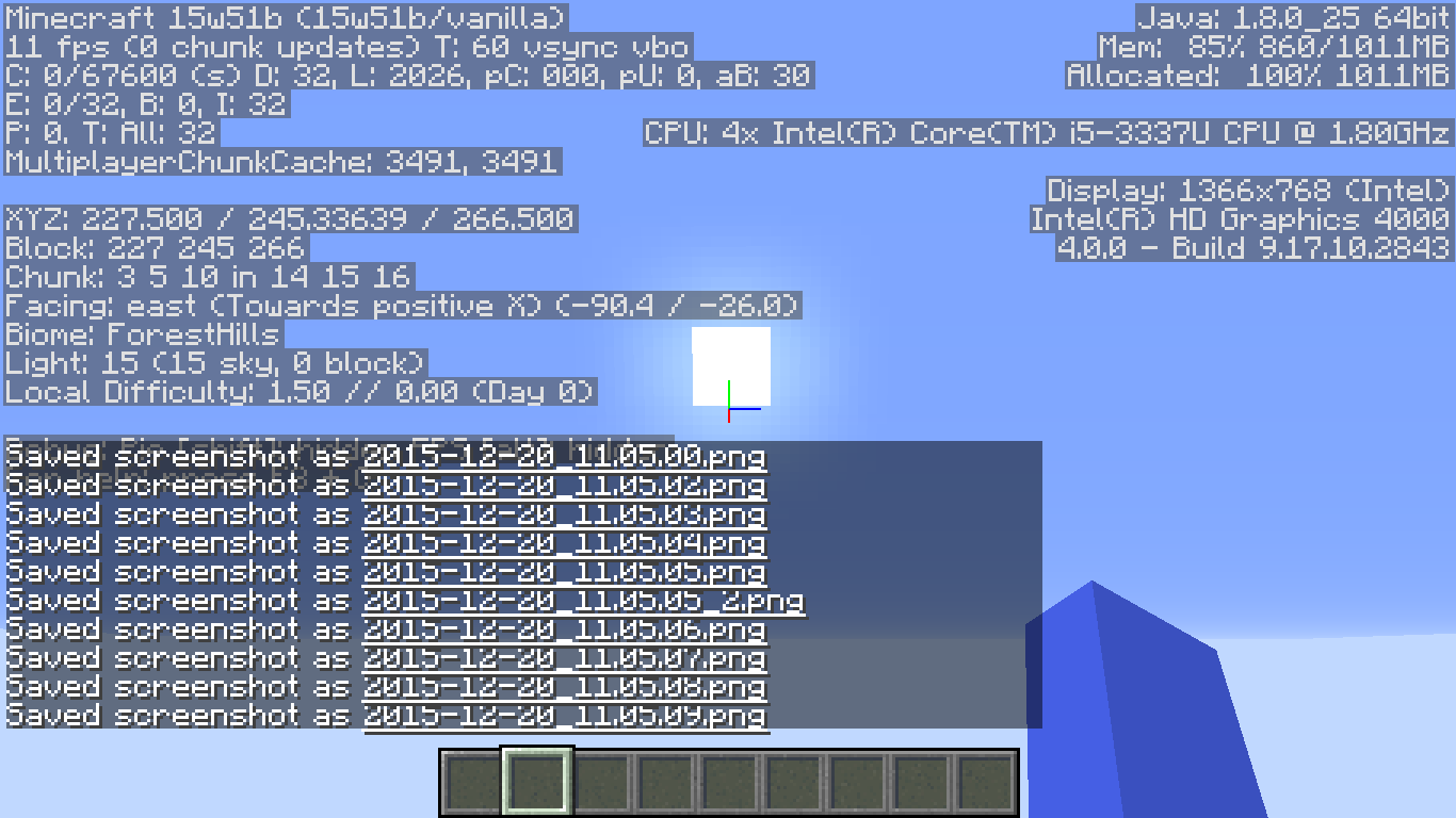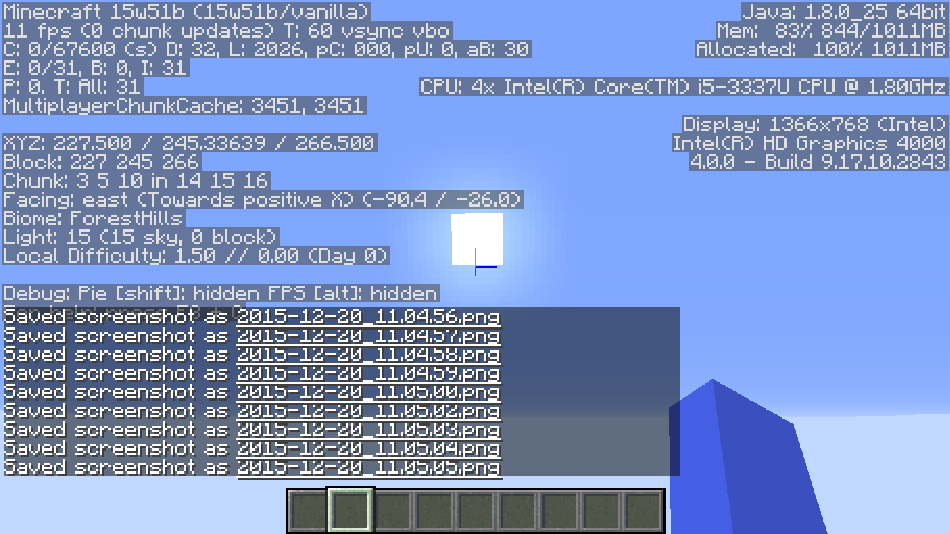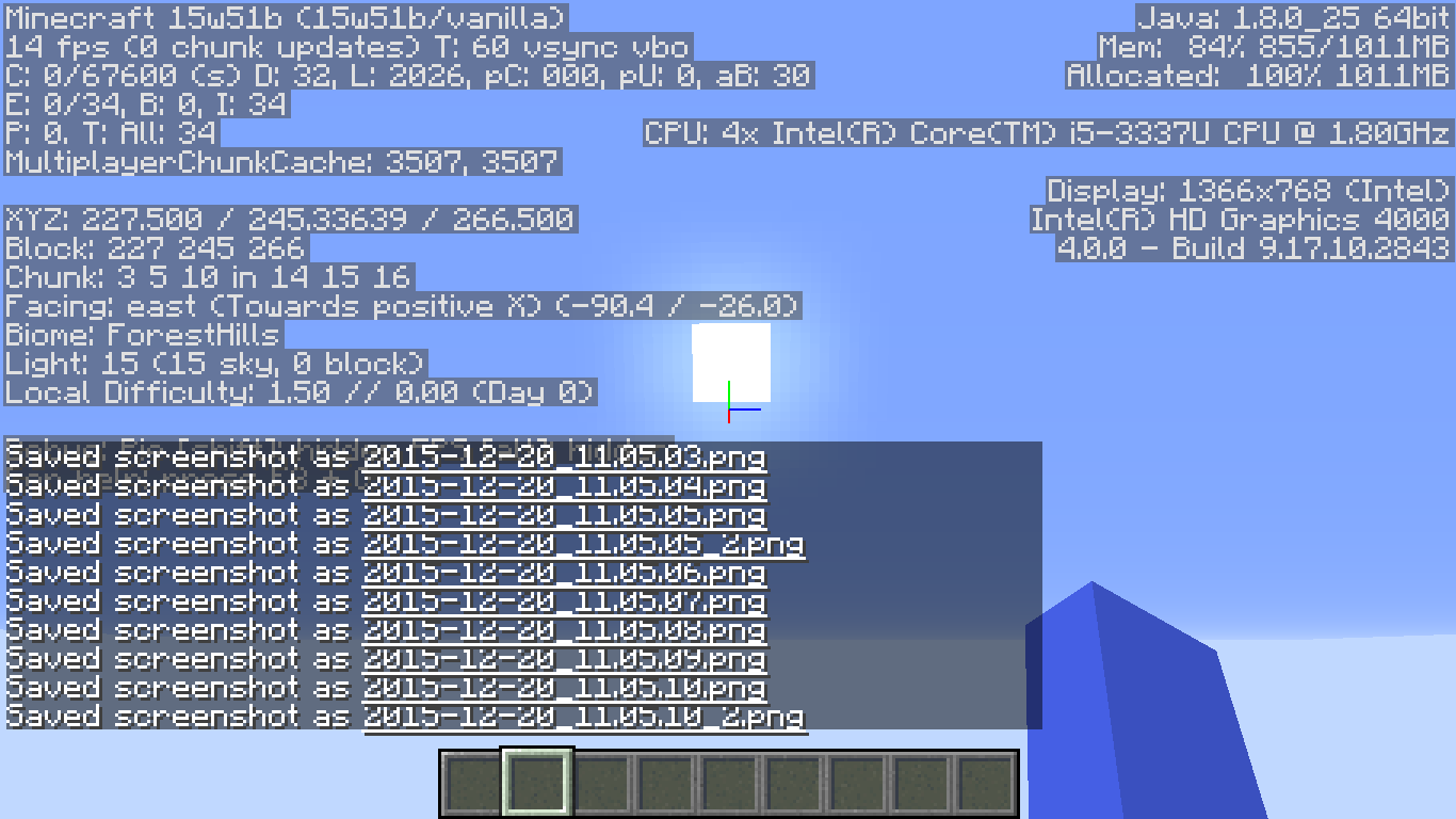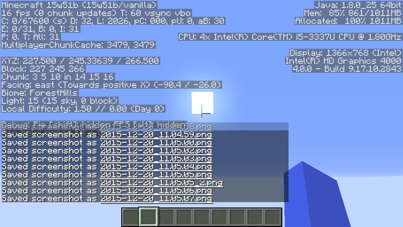 I was fooling around a little in Snapshot 15w51b in Creative mode, and I created a new world. As I flew upwards to see what had generated, I noticed the Sun had an odd jerky animation. It would rise up a few pixels and then fall down again. Figuring it was maybe because I was so high up, I landed on the ground and looked again, but it was still happening.