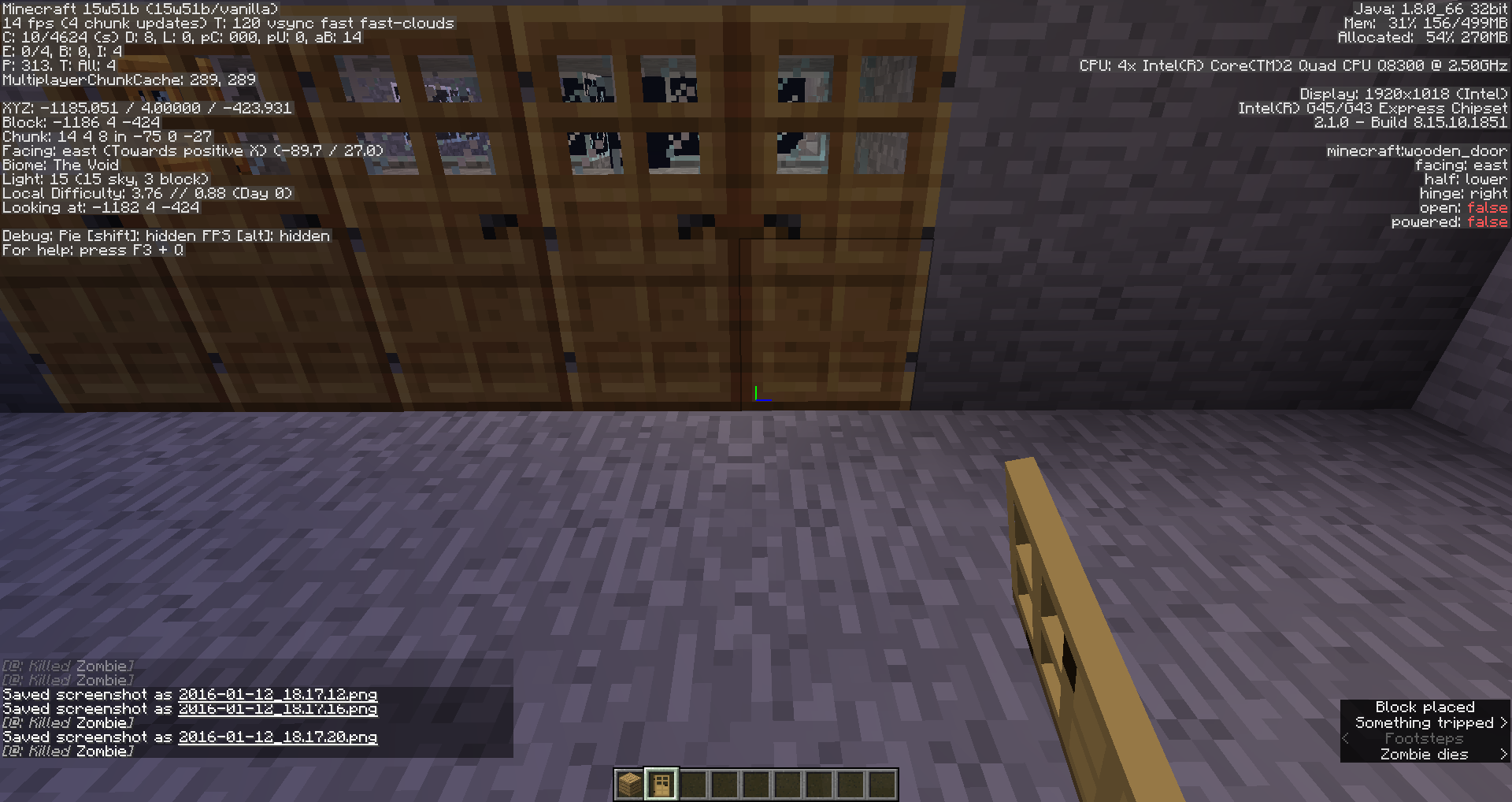 Example: If you place a door by blocks on its right side and click on the left half of the block under the door, the hinge does not line up with the left half of the block and instead, the hinge is on the right side, next to the blocks on the side of the door. The same happens vice versa.