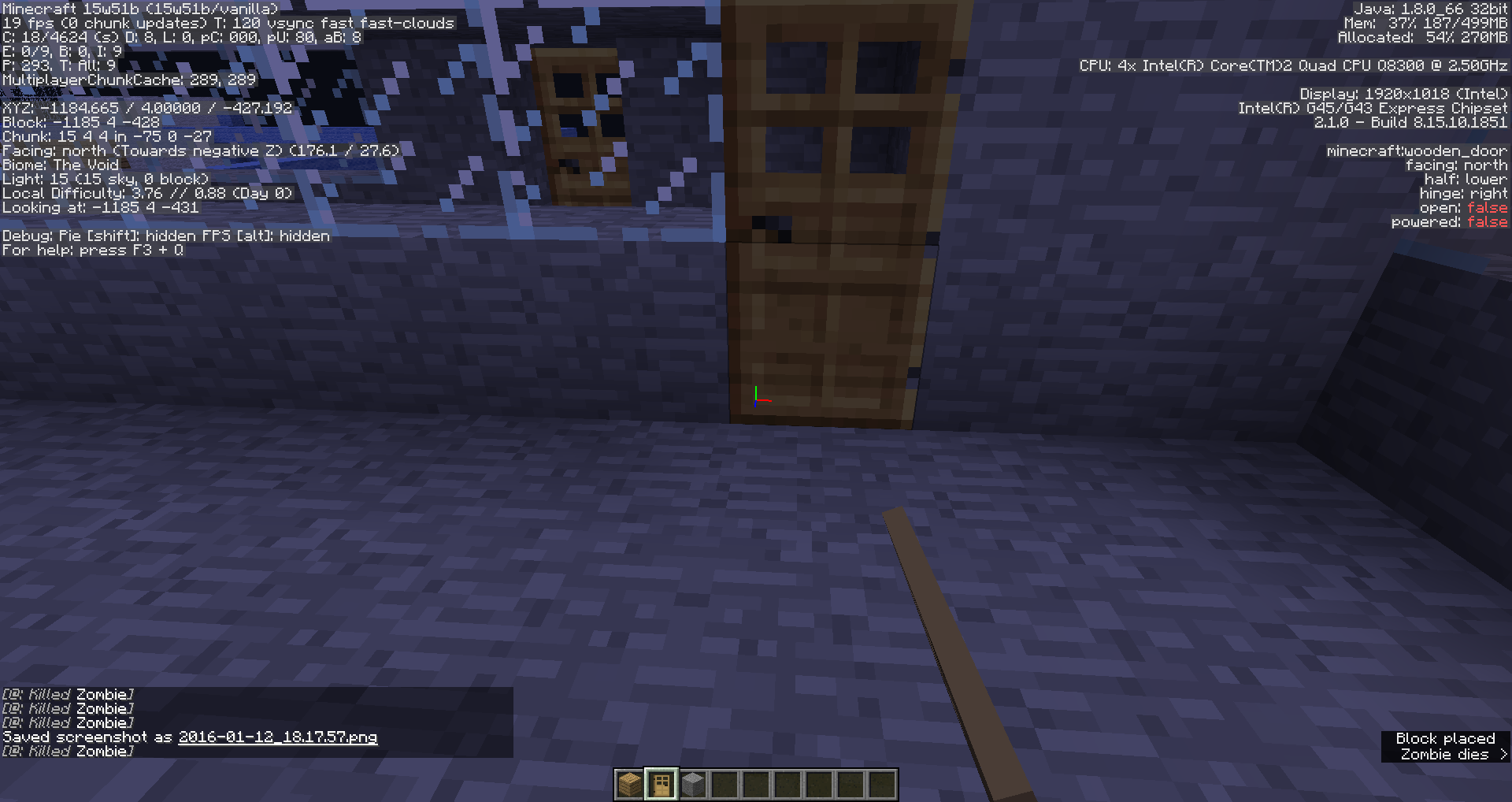 Example: If you place a row of consecutive doors next to one another, the hinges will not line up with the half of the block you clicked on. This only happens when the half of the block you clicked on is next to the handle of the neighboring door.
