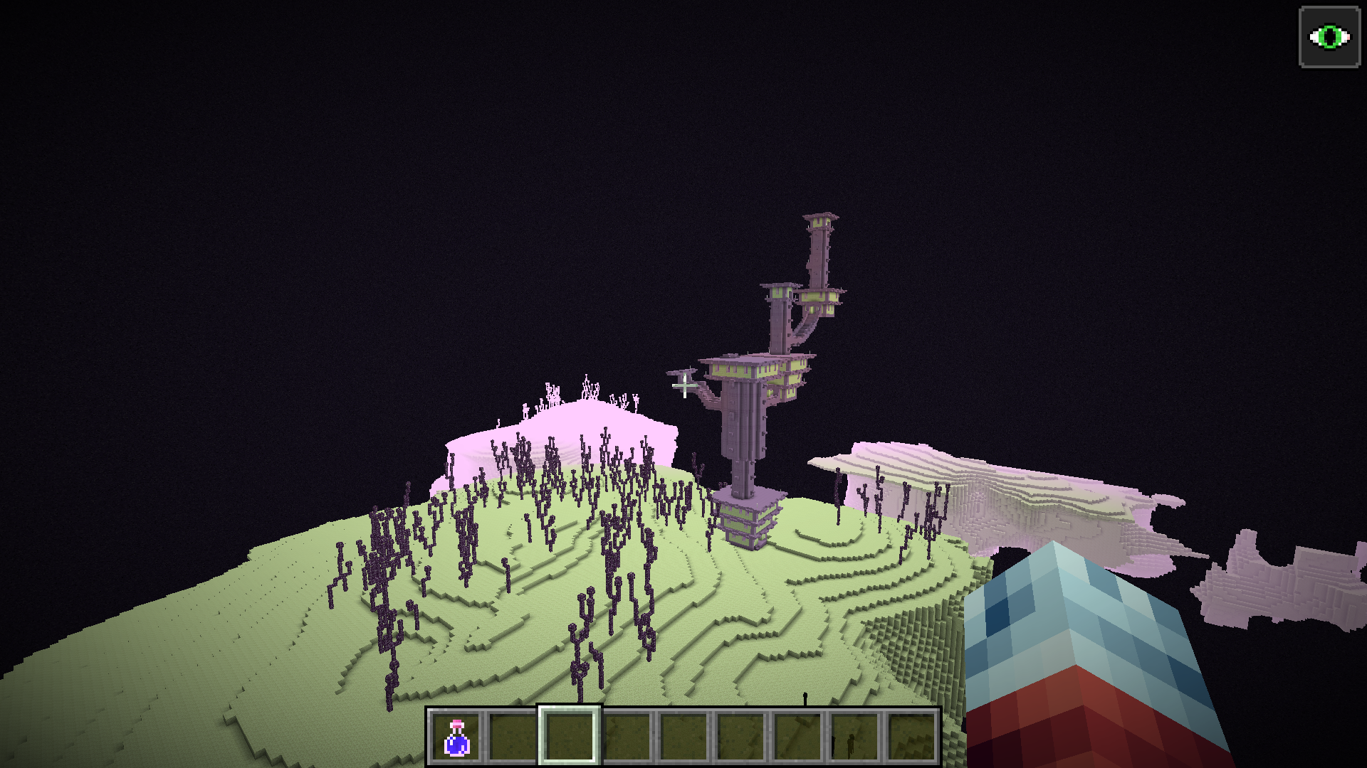 If your render distance was 12, there will be a line of purpur stairs from (1372,92,-265) to (1387,94,-265) that made up the very edge of one building.