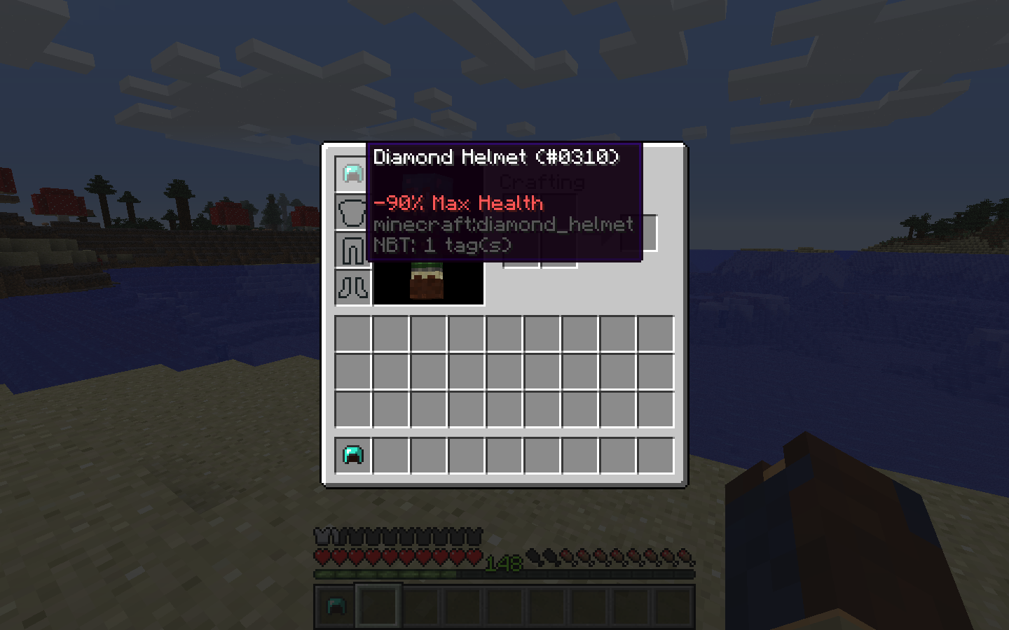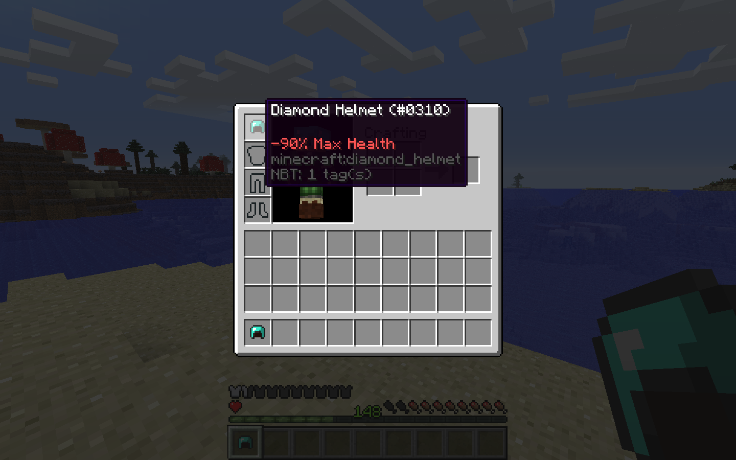 /give @p minecraft:diamond_helmet 1 0 {AttributeModifiers:[{AttributeName:"generic.maxHealth",Name:"generic.maxHealth",Amount:-0.9,Operation:1,UUIDLeast:408588,UUIDMost:100271}]}