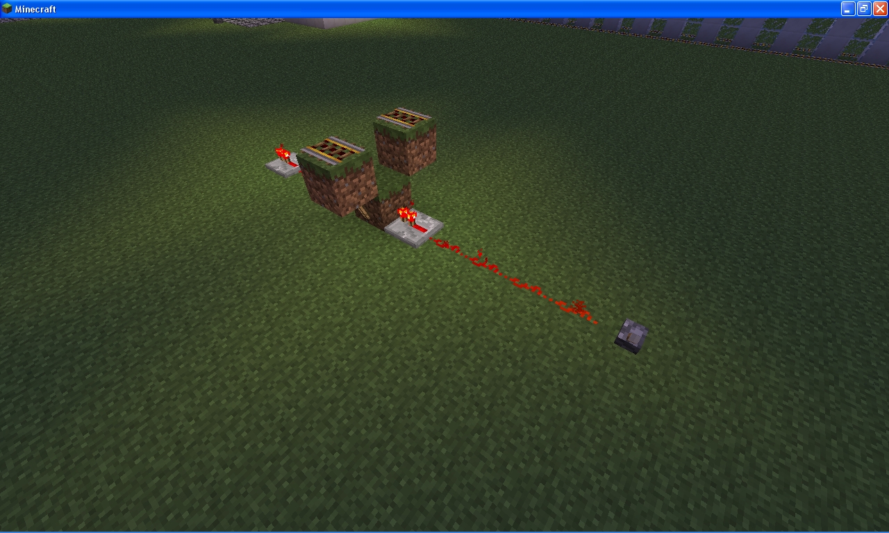 Кстати, посмотрел на скриншоты, и скажу, что расстояние между каждым повторителем как максимум 6 блоков (1 блок после каждого повторителя - земля, а другие пять, ведущие к другому повторителю от этого блока, - красная пыль).