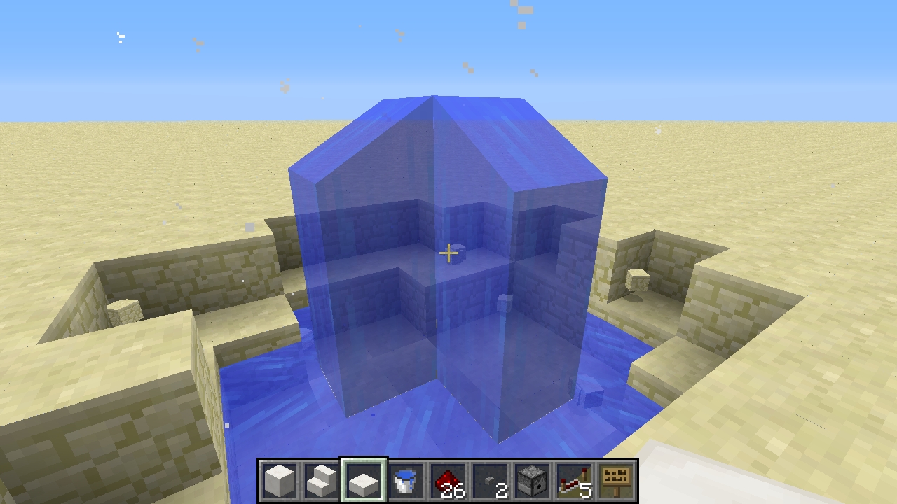 1 - TNT dispensed into solid block with water above which it should move into, stopping the explosion from damaging blocks. Entire apparatus blows up. (Pictures 1-3)