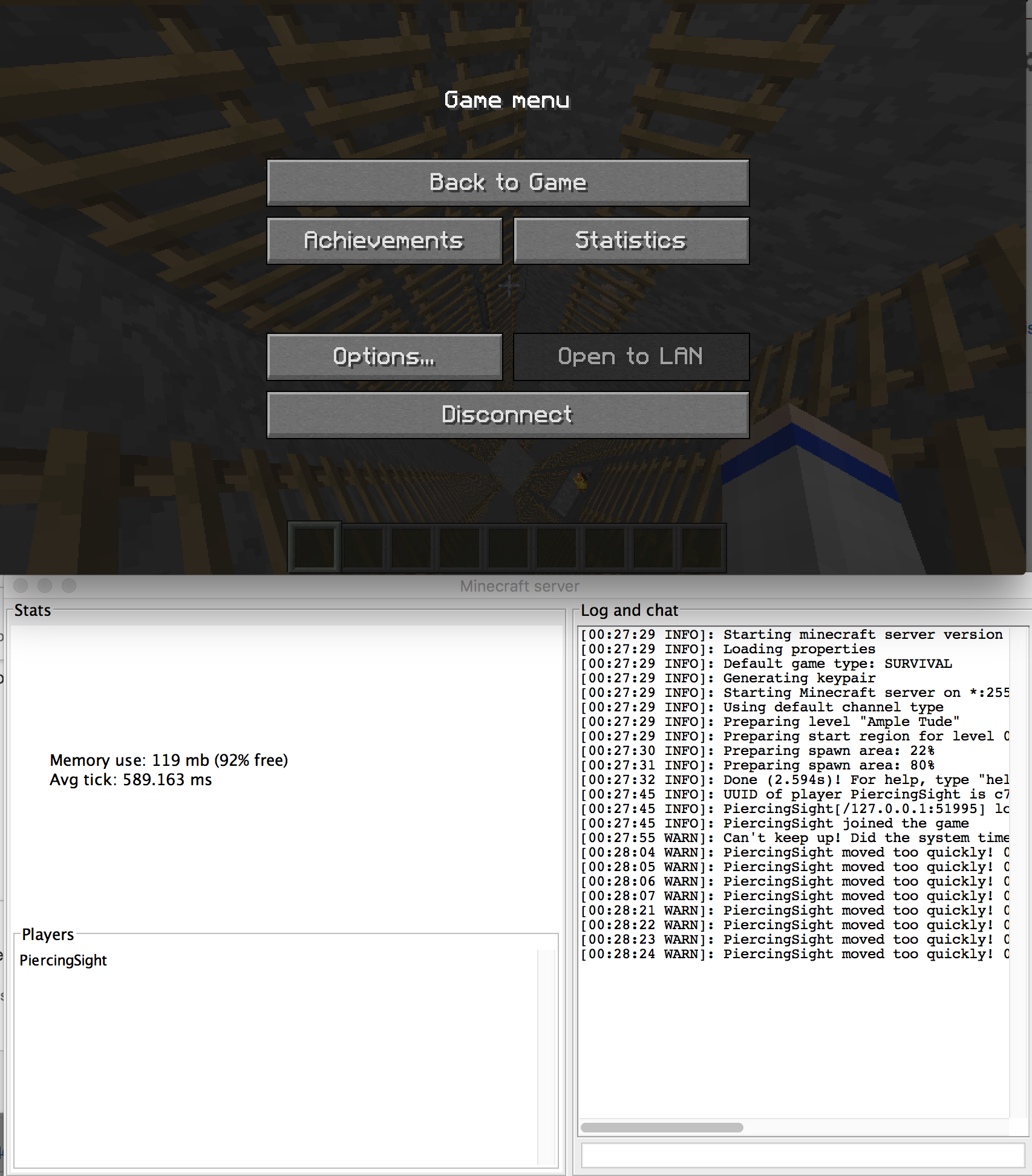 A massive amount of tick lag when moving vertically in the server. Whether falling or flying in creative mode, vertical movement causes massive lag spikes that can reach an avg tick of 600ms or more. This causes the server to repeatedly say "Can't keep up!" — and "Player moved too quickly!" when falling — before eventually crashing.