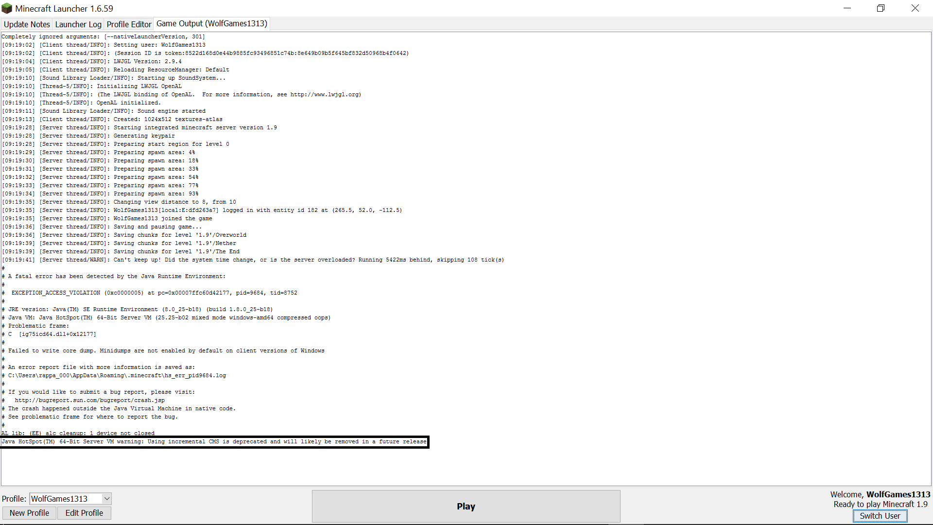 I am opening my minecraft regulary and it shows me the menu but when i want to connect to a server or to play singleplayer i am clicking and the world I want to open and minecraft is crashing with these address: Java HotSpot(TM) 64-Bit Server VM warning: Using incremental CMS is deprecated and will likely be removed in a future release