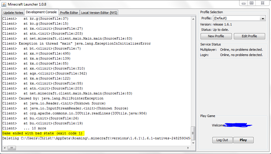 When I open the launcher and press play and it say's Game ended with bad state (exit code 1)