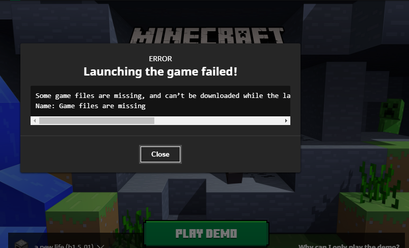 So, I was on the Launcher after I logged into my account. I just downloaded the standard one and just tried to play the demo version of Minecraft. My internet is actually fine, but every time when I try to play one of the versions, it says: 'Some game files are missing, and can’t be downloaded while the launcher is in offline mode. Please connect to the internet and try again.