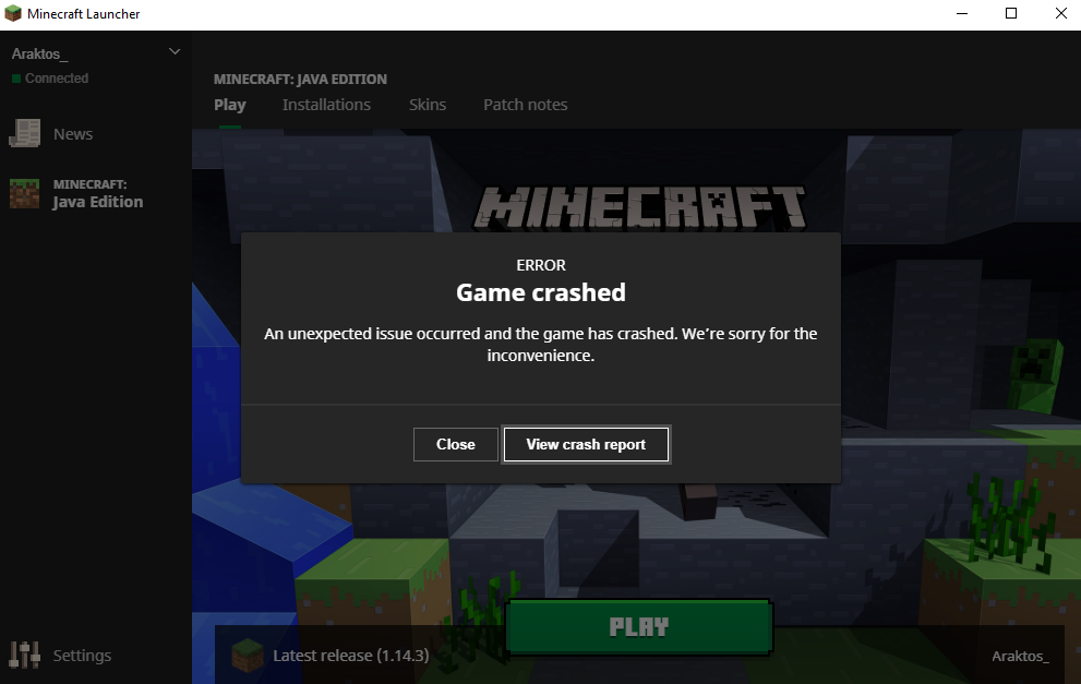 Same exact thing is happening to me after redownloading java edition 1.14.3... also unable to view crash report