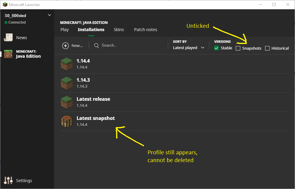 The new Minecraft Launcher downloads each pre-release JAR to the versions folder even though I have "Snapshots" un-ticked in the "Installations" tab. The "Latest Snapshot" profile still appears and cannot be deleted. In the old launcher, unticking the "Snapshots" tab would remove the "Latest Snapshot" profile and prevent the launcher from downloading pre-release JARs.