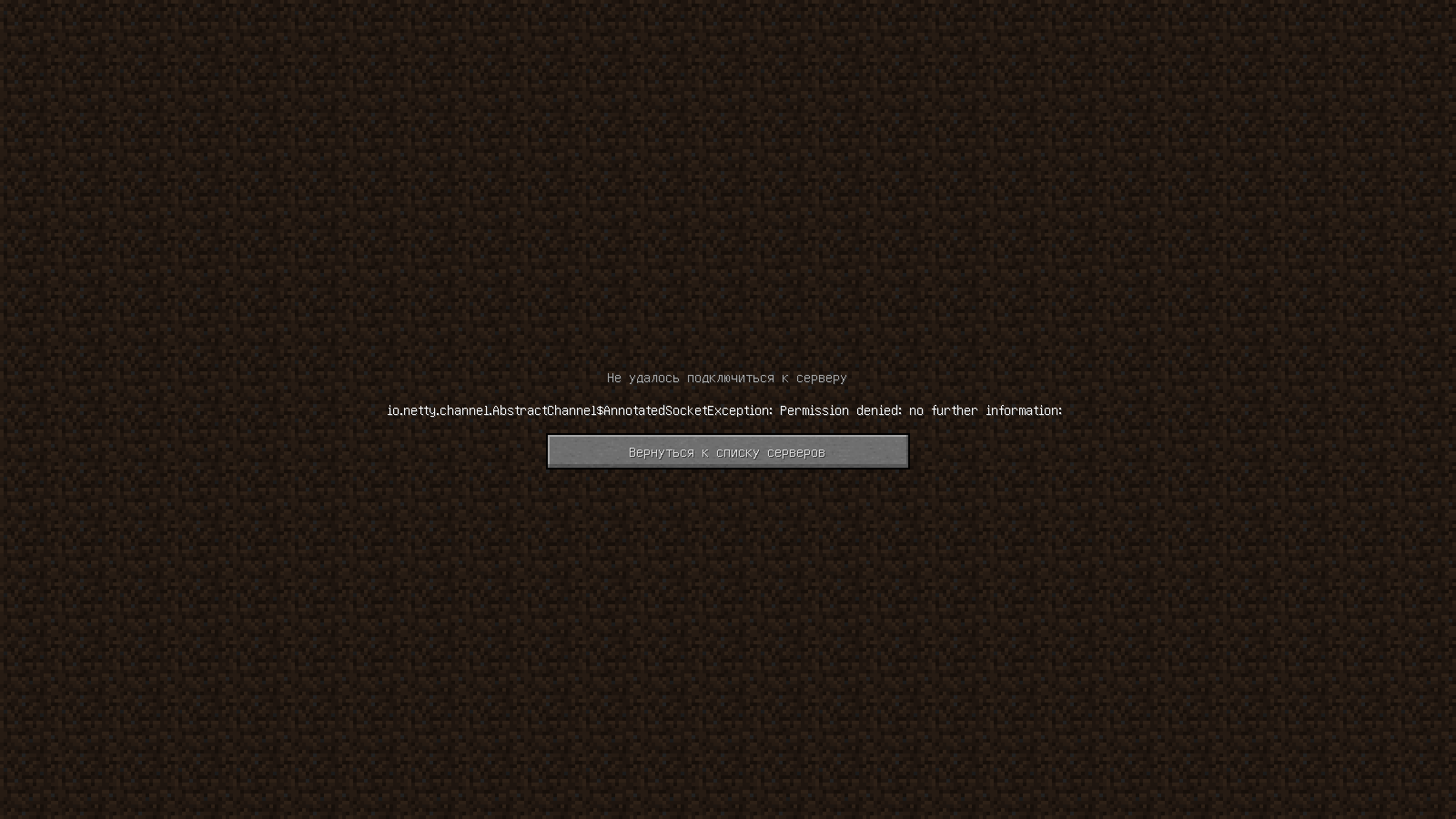 io.netty.channel.abstractchannel$AnnotatedSocketExeption:permission denied no further information This error writes as soon as I try to log on to any servers.Help me solve the problem