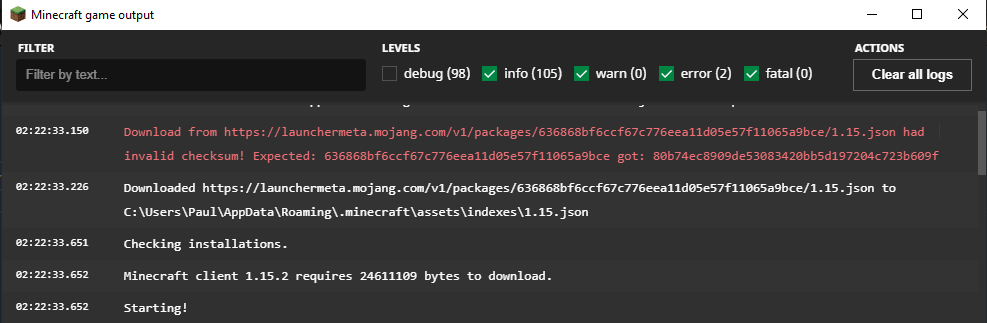 Download from https://launchermeta.mojang.com/v1/packages/e022240e3d70866f41dd88a3b342cf842a7b31bd/1.17.json had invalid checksum! Expected: e022240e3d70866f41dd88a3b342cf842a7b31bd got: b9595f25b9a5aa2a27fb6bcd414604bf5cc4efc0