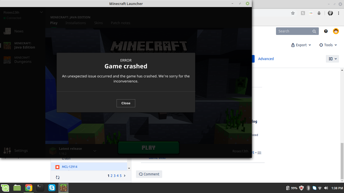 The launcher starts up just fine, I click play, the loading bar says preparing, then this error appears. I have completely deleted Minecraft and the launcher off my computer and re-downloaded them, but it didn't work. I use Linux Mint.